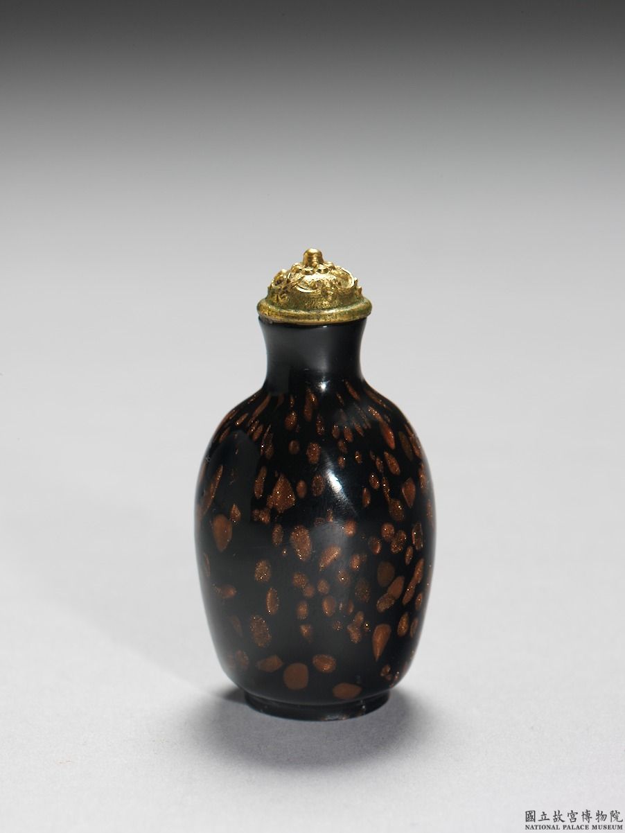 灑金星玻璃胎圓瓶式鼻煙壺。黑色不透明玻璃為地,摻不規則點狀金星玻璃,製成小圓瓶,底有「乾隆年製」楷書刻款。帶銅鍍金雕花蓋與牙匙。