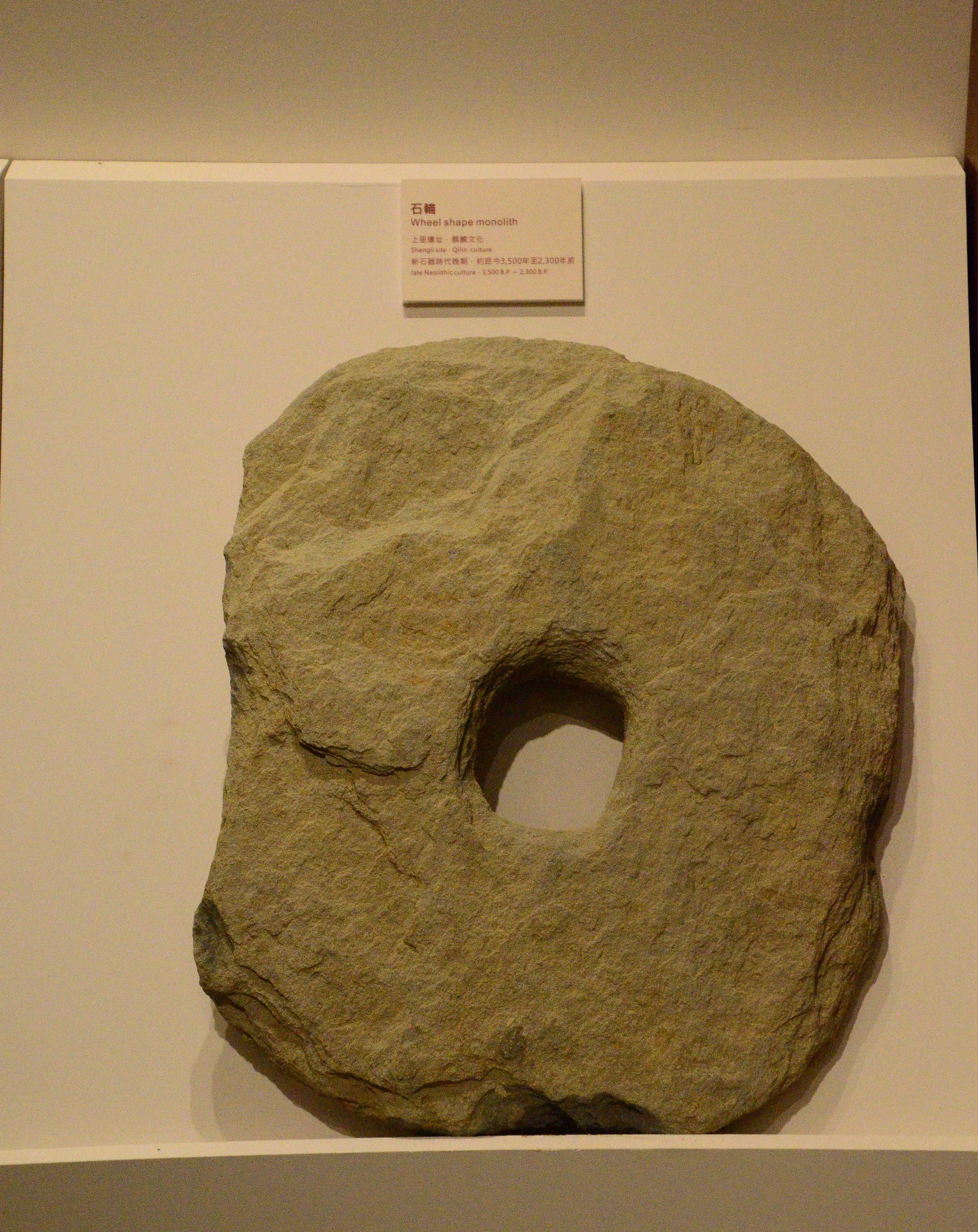 石輪或稱輪型單石,是將單石打製成近似圓形輪子的石塊,中央再打鑿出一個圓孔,也可稱有孔石磐。本件石輪長55公分、寬55公分、厚6公分,是來自距今約2,300年的麒麟文化(或稱巨石文化)的大型單石。麒麟文化(或稱巨石文化)是臺灣新石器時代晚期的文化之一,分布於花蓮縣新社到臺東縣都蘭之間。其代表性遺物有人形石像、單石、石輪、岩棺、石壁等石造物。這些大型石造物有可能是房舍建築的一部分,或與儀式行為有關,但尚無定論。