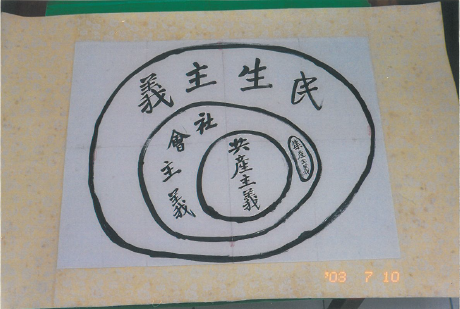 本件是孫文手繪之「民生主義」概念圖,以圖解說明民生主義的內涵遠較社會主義、共產主義和集產主義為廣,可以透過三民主義的具體實踐,達成民有、民治、民享的理想社會。 此手稿藏本為民國13年(1924)1月23日孫文構思三民主義哲學體系時之手繪概念圖,可謂是記錄其建國政治理想思維過程之手迹文獻,彌足珍貴。