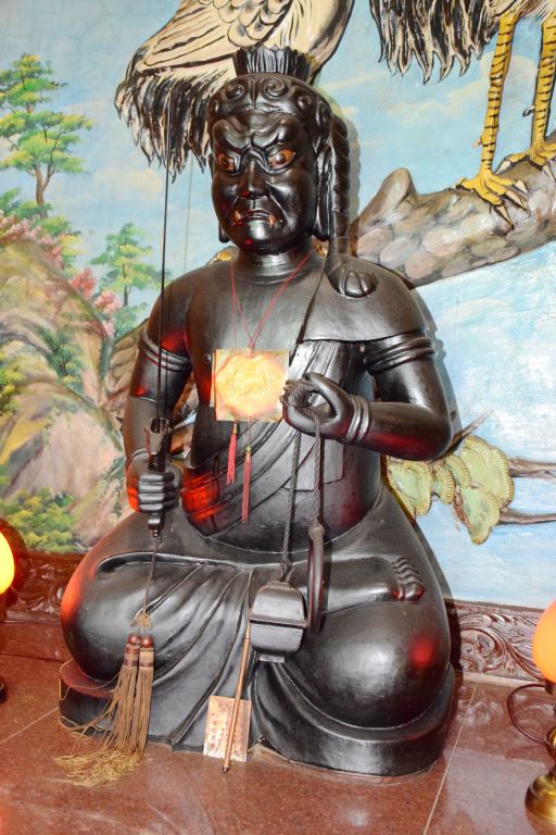 木製,頂有七髻,頭左垂一辮髮,眼與齒上有橘色,下唇咬上唇,右手持劍,左手持索,色青黑,坐大盤石。