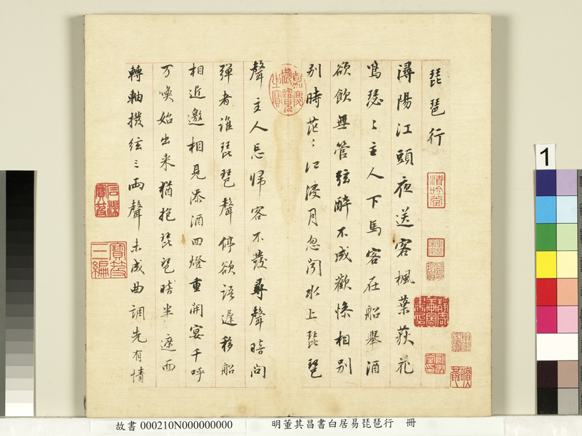 董其昌(1555-1636),晚明書壇領袖,是影響明清兩代的重要書畫家,其提出的許多書論與畫論,至今仍是書畫史研究的重要課題。 對於董其昌而言,文章內容與書風的選擇往往是有意識的,如此才能達到相得益彰的效果。其曾云:「白太傅〈琵琶行〉,恨不逢張伯高書之」,故而以懷素狂草筆意書寫,希望可以重現當時的清狂之狀。此冊字雖小用筆卻相當精到,點畫間毫不苟且,體勢頗近米芾,為其米體小行草之佳作。