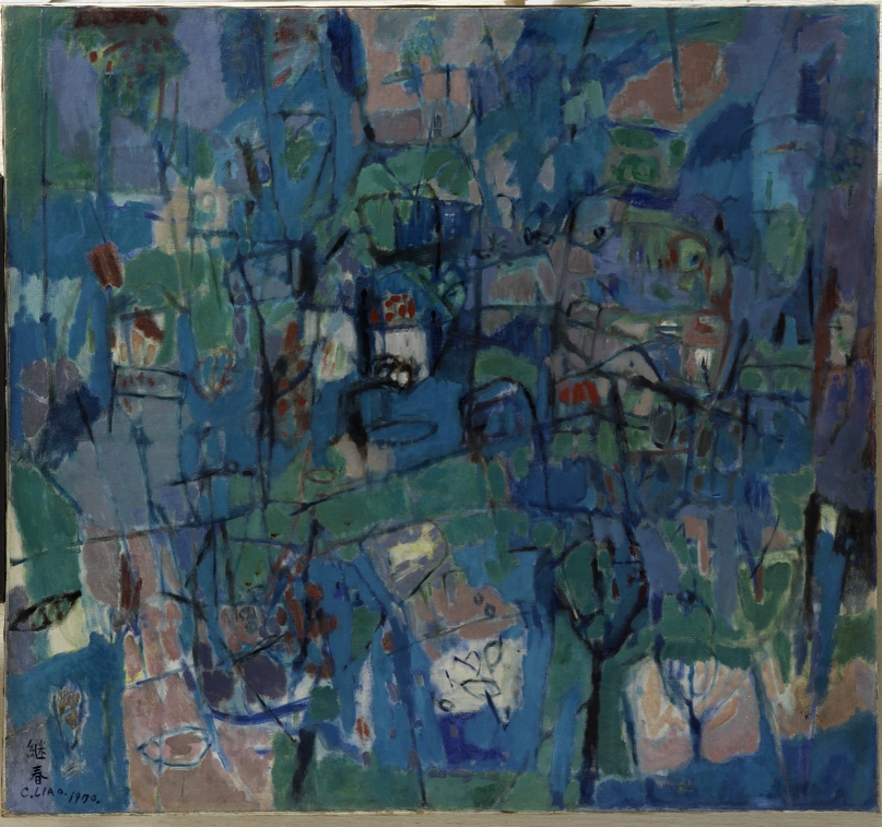 1. 藝術家融合抽象表現之代表作,也是風格轉變的記錄之一,風景抽象化,色彩豐富活潑,筆調暢快,頗為廖氏之特徵。 2. 作品尺寸夠大,抽象表現空間甚具特色,以單純豐富之藍、灰、綠為主調,透過微妙的紅色點綴,具體呈現風光景物,空間鋪陳及色彩表現,具藝術之成就,也是畫家抽象風格成熟表現。