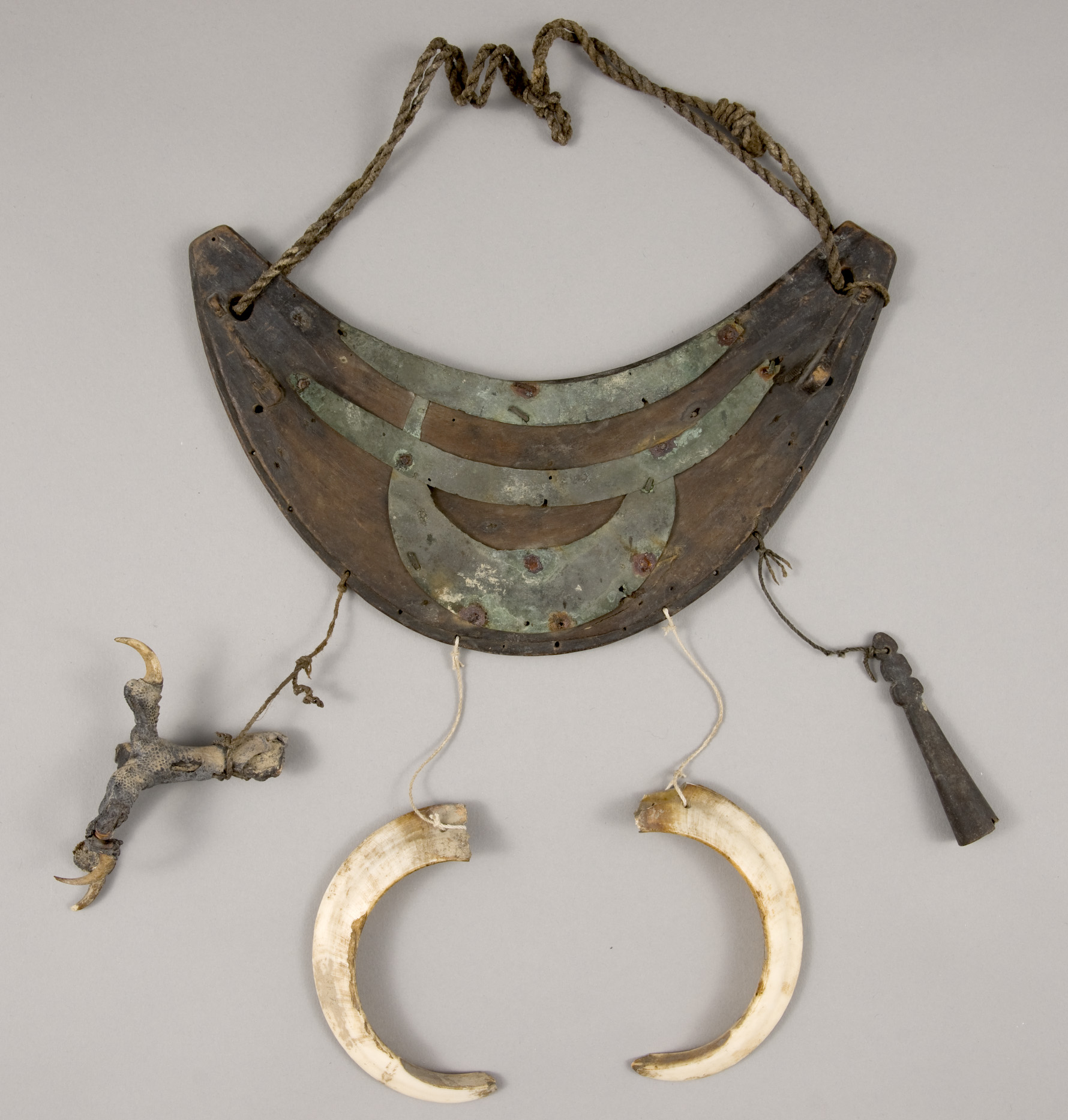 本件係以一半月形木片為主體,木片正面上以鐵釘固定有三個彎形銀片,其下則綴有四件附屬飾物。四件附屬飾物分別象徵代表的文化意涵如下:左側「猛禽腳骨」代表胸飾主人曾經捕獲該獵物的象徵物,因為猛禽類在蘭嶼社會中是一種可遇不可求、難以捕獲的獵物,因此將它綴飾在胸飾上藉以誇耀自己的特殊能力。中間兩個「公豬獠牙」則是代表自己擁有豢養豬隻的財富能力與社會聲望,隱喻自己舉行過諸如房屋落成禮或船下水禮等重大祭典,曾經宰殺許多豬隻、分享族人的歷史紀錄。右側「金屬器物零件」雖無法判定為何種工具或器物之零件,但其現代器物的外觀與屬性,亦可以展示胸飾主人適應時代變遷、趕上潮流脈動的特殊意涵。