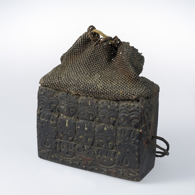 1.占卜箱(kanupitj / kanipi)   排灣族的占卜箱,是排灣族巫師用來放置占卜用具的容器。放置的物品,因部落不同而有所不同,但大概都有小鐵刀(或鐵片)、竹筒、木製方盤、豬皮、豬骨、樹皮、果實、小葫蘆、卵石等。 本件箱體正面由人像紋、半身人像紋及人頭紋組成。人像紋手部做祈禱狀,眼部、頭部及身部均飾有釘狀物,下方則有一條雙頭蛇紋,同樣飾有釘狀物。箱體之一側則刻有半身人像紋。占卜箱開口的一端,結附有麻線編成的細網,網口綴附有藤編小環,小環貫穿小繩,作為束紮之用,並連結有繩子,以利巫師外出時可背帶。   此外,占卜箱由網袋與木箱兩部分所組成,傳統上鉤網是女性的工作,木雕是男性的工作,所以這是男女分工合作的物品。 2.青銅刀   占卜箱內的用具之一,本件材質為銅製,長約17公分左右。占卜箱中所擺放的青銅刀是稱為祭刀(siquni),主要作用為切割祭品以饗鬼神,但通常只是做象徵性的切割動作。祭刀刀柄通常會有花紋的裝飾,但不同區域則有不同形制的差異發展。一般而言,西排灣區域大多為青銅刀柄,而在東排灣區域則有木柄或包著錫皮的形制出現。   主要作用為切割祭品,但通常只是做象徵性的切割動作。一般而言,西排灣區域大多為青銅刀柄,而在東排灣區域則有木柄或包著錫皮的形制出現。 3.神珠盒   占卜箱內擺放的用具之一。本件材質為木製,盒體施有紅彩為襯底。 神珠盒的作用在於收藏神珠zaqu,為神靈的座位。 4.種子/果實(zaqu)   為排灣族占卜箱內擺放的用具之一,zaqu被排灣族人視為是神靈的代表物,它是神所賜與的,等同是巫師的「執照」。有了zaqu,巫師才能「通神」,與神溝通講話。據說,zaqu自己會到處亂跑。當一個巫師失去了靈力時,zaqu就會自己回到天上。   就材質而言,zaqu其實是直徑約1.5公分至2公分的黑色欒木樹果;本件標本即由五粒種子組成之「神珠(zaqu)」。但是,排灣族人絕不承認zaqu就是樹果的一種。因為zaqu表面看起來雖與樹果相似,但在排灣族人眼裡zaqu就是神靈的代表,可以來去自如,甚至會出現擬人的人面花紋。傳說中,巫神若看中某女有資格做巫師,就會從天上投下zaqu給她,使zaqu落在她身上或附近之處,暗喻她必須從巫。此後,這個zaqu就代表著巫神與她同在,並協助她從事巫術的工作。平時,zaqu即收藏放至於「神珠盒」之中。   根據文獻記載,占卜箱內另有一竹筒和方形木盤,竹筒內置豬骨及乾豬皮,作為祭品的象徵,合起來代表一隻完整的活豬;木盤則為施法時放置祭品及道具之處,有時巫師也會採用新鮮樹葉(榕樹、桑樹等)作為祭品的盛放處。
