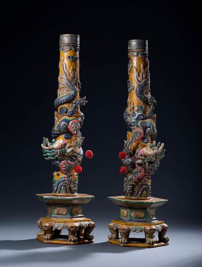 作者:葉王(1826-1887),原籍福建漳州府平和縣,生於嘉義打貓。本名麟趾,字單名「王」,作品署名葉王,號和雲,外號為「獅」,時人以王獅相稱,後世尊稱為「王師」。 技法:手捏塑形,素坯1050℃燒成,釉料分900℃、750℃二次上釉燒成,組裝採第二次釉燒黏結及三合土組裝黏合 綜合描述:葉王傳世作品中絕大多數是為廟宇施作的「廟尪仔」,其皆依附於建築裝飾之上。此對燭臺則為葉王交趾陶現存極少見兼具實用與賞玩的器用之物,且風格細膩寫實,釉色璀璨富美,充分表露出葉王獨特的藝術造詣,更顯珍稀可貴,實為葉王極少數傳世作品中之精品。 此對蟠龍燭臺,與一般「有前無後」之建築裝飾用交趾陶不同,其造型立體,360度皆可觀賞。葉王巧妙地將燭臺柱狀的器形與蜿蜒盤長的蒼龍(四爪,或稱蟒)結合,蒼龍纏繞盤旋著柱身,左右相對,皆做尾上頭下的降龍造型,造型同中有異,其間並裝飾波紋及瑞雲朵朵,反映出民間對龍能興風致雨的想像,頂端燭口可供立燭之用。龍頭、龍腳與臺座等處亦分開塑燒再組裝而成,在在可見技藝的精良與匠心獨具。 在釉色施作上,葉王藉由古黃與古藍的對比將蒼龍跳脫於柱身,一方面又在古黃的柱身上綴以淺浮雕、施以藍色系釉色的雲紋與潮紋,以及龍身上的胭脂紅、翡翠綠、黑、象牙白等釉色,讓作品整體充滿和諧華美的視覺效果,展現獨特的藝術風格及歷史感。