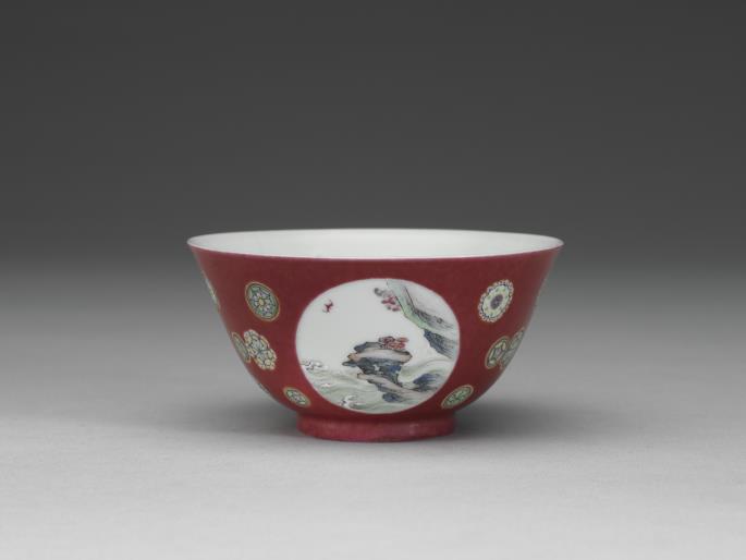 清宮造辦處生產的琺瑯彩瓷,是盛清代表工藝之一。製作精美,且傳世數量相當稀少,紋飾、題材縱有成對,亦無一相同,乾隆時曾降旨整批珍藏。 雍正朝是琺瑯彩瓷發展的關鍵轉折階段,產品質量俱佳。本作器內壁模印蓮池紋,碗心有「永樂年製」四字模印篆款。器底有「雍正年製」二行紅料楷書款。外壁滿施紅地,其上有團花裝飾及三個白地圓形開光,分別繪有「瑶琳仙境」、「竹枝雙鵲」、「福祿壽喜」等吉祥圖案,粉色靈芝以金紅玻璃製成琺瑯料上彩,尤為特殊。此作繪製細膩,紋樣精緻典雅,為雍正琺瑯彩瓷佳作。