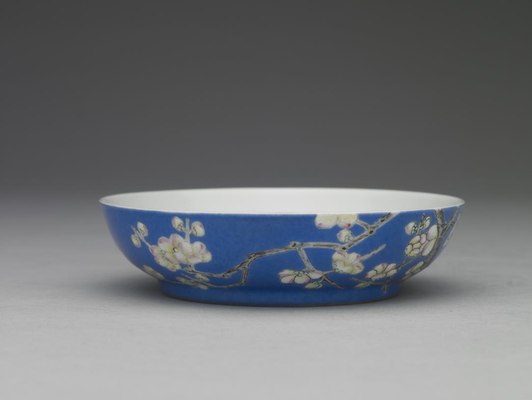 清宮造辦處生產的琺瑯彩瓷,是盛清代表工藝之一。製作精美,且傳世數量相當稀少,紋飾、題材縱有成對,亦無一相同,乾隆時曾降旨整批珍藏。 雍正朝是琺瑯彩瓷發展的關鍵轉折階段,產品質量俱佳。此作器內無紋,釉色略帶灰黃。器外壁以藍色為地,彩繪梅樹一株,其上開滿白梅,繪製細膩,紋樣精緻典雅,頗具雍正時代特色。器底帶「雍正年製」字款。此外,本作傳世僅有二件,且能對照陳設檔案史料,益顯珍貴。