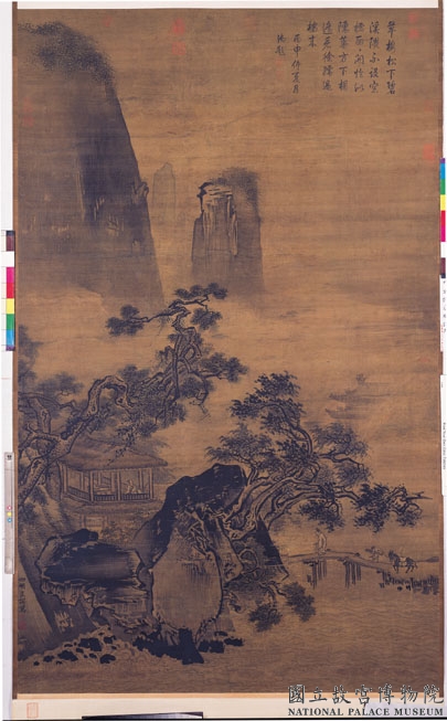 前景巨岩硬峭及樹木曲屈,以重墨刷染,運筆迅急強勁;枝葉苔點方折多變化,墨色濃淡分明。描繪山石肌理用「斧劈皴」,少凹凸立體感,略趨平面化。畫上署款「四明王諤寫」,鈐「東原」、「廷直」二印。王諤(約活動於15 世紀晚期至16 世紀前期),字廷直,浙江奉化人。明孝宗(1488-1505 在位)弘治年間以繪事供職仁智殿,孝宗喜愛馬遠(約活動於1189-1225),稱其為「今之馬遠」。明武宗(1505-1521 年在位)正德初授錦衣千戶,為明代中、晚期重要宮廷畫家。
