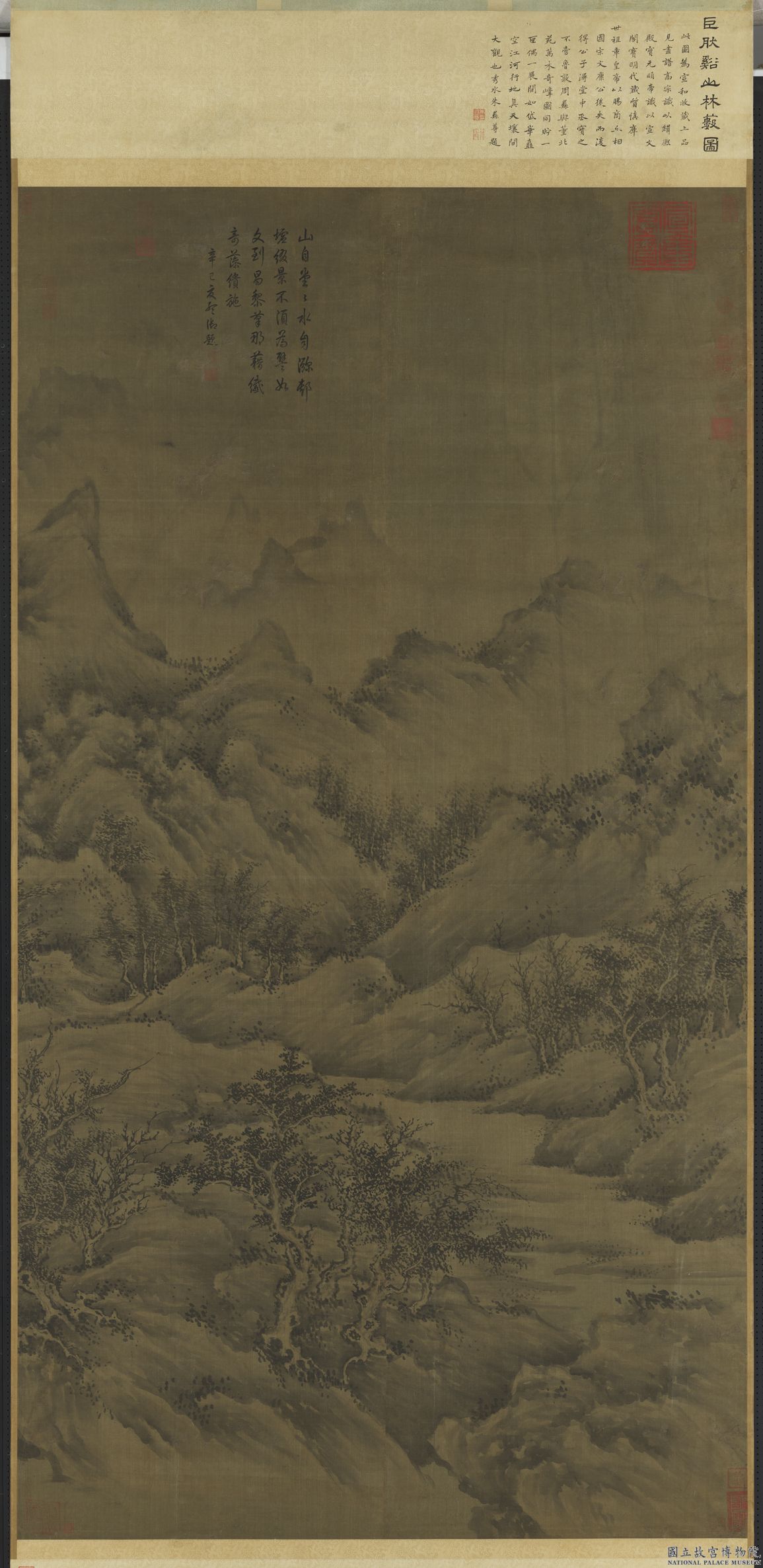 本軸無畫家名款,舊籤題雖稱巨然,學者以故宮所藏江參〈江山千里〉長卷,因有元代鑑藏名家柯九思之跋,定為江參(約活動於北宋末南宋初)真蹟。兩相比較,用筆用墨,皴法畫法,可証為同出一手,是以為傳世可見之江參畫風作品。 畫中坡石以濃淡墨染營造質感,時時流露出表現大氣與光線之用意。惟部分山間叢樹之墨點筆法,已與北宋晚期所見巨然山水畫軸表現稍有距離,或許是略晚於十二世紀之風格,但仍可稱為南宋所常見的繼承董源巨然畫風,實屬宋畫佳作。且本件為大軸,得以保存至今,殊屬可貴。