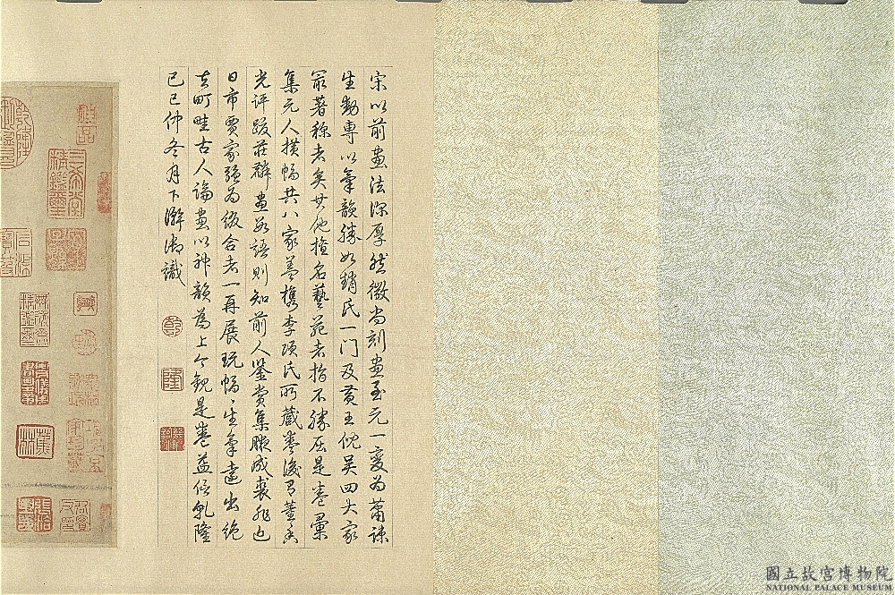 此卷匯集八位元人作品,均屬元代活動於江南地區之畫家,合成一卷十分難得。 畫卷前兩作歸入趙孟頫、管道昇畫作。第三段倪瓚〈安處齋圖〉是其少見橫幅山水構圖,巧妙表現其一河兩岸特色。吳鎮〈中山圖〉渾圓山體延續又有墨色變化,充分顯示其筆墨淋漓的山水特色。馬琬〈春山清霽〉採黃公望風格,筆墨點染更為繁複而別具風貌。趙原〈陸羽烹茶圖〉以唐代品茶名家陸羽為題,構成一處由山水環繞的品茶理想空間,近景用趙孟頫發展出的李郭風格,遠山則兼採董巨傳統,顯示其精采綜合畫風。最後為林卷阿、莊麟之作,傳世罕見。 其中倪瓚、吳鎮兩人之作為其較少見之橫卷形式,十分難得。另外馬琬、趙原、林卷阿等人的山水橫卷現存作品稀少,本卷所見者均屬極精善之作,實屬難得佳作。