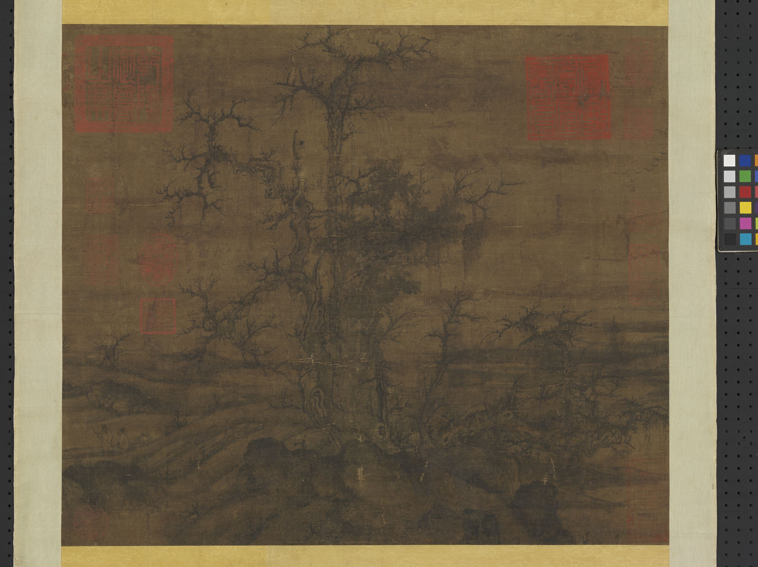 本幅無名款,畫中描繪坡岸上有林木叢生,儼然是採李成平遠山水樣式。林木造型有蟹爪狀枝梢,坡岸石塊構成平遠構圖,與郭熙畫風似有聯繫。畫幅上有「宣文閣圖書印」、「司印」半印,可見歷經元明宮廷收藏。 此作畫境蕭疏,寒意逼人,將北國一望無際之遼闊平原,秋冬之景,表露無遺,堪謂宋畫佳作。畫面絹質曾經過修補,部分筆墨或為後人所補,此為古畫常態,不影響整體山水特徵。小軸反映出李郭派山水的平遠構圖樣貌,為有別於郭熙〈早春圖〉的高遠景像之外的重要例證。 李成、郭熙畫派影響及於宋、元,此作為李郭派存世典型作品之一,具藝術史重要價值。