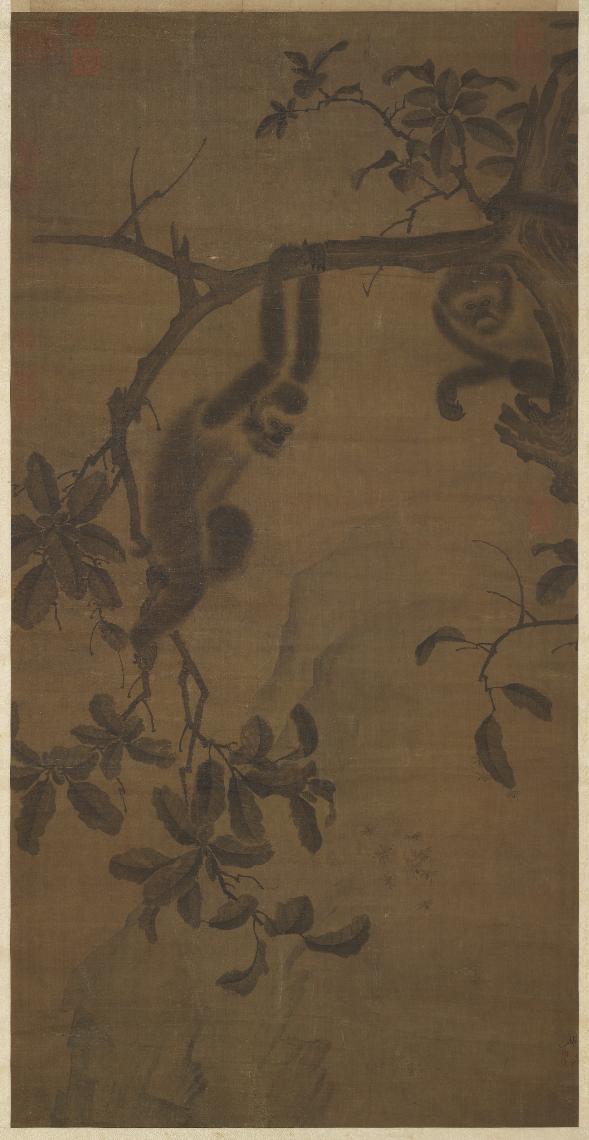 顏輝(約13世紀至14世紀初),字秋月,浙江江山人,一作江西廬陵人,善畫道釋人物及寫生,筆法奇絕。中國歷代畫猿猴畫家不多,顏輝畫猿饒富生意。此軸懸崖樹上,二猿攀爬向下俯瞰。眼、口、鼻等部位,細筆勾描,周身不作輪廓鉤染,全以淡墨乾筆塗擦,形象真實生動。右下有蜂群飛舞,兩猿目視,意態生動。猿猴和蜂取「封侯」諧音,為祝賀升官封侯,富有吉祥寓意。 此軸邊角式構圖與迷濛氣氛皆為南宋風格,顏輝受南宋禪畫影響頗多,喜作水墨粗筆,用筆勁健豪放,略近梁楷潑墨減筆畫,而風格更加粗獷。所繪道釋人物,具有筆墨技法與想像力,廣受江南士大夫及浙江寧波一帶人們所喜好,為南宋末、元初重要的民間職業畫家,則對明代浙派畫家有啟發的貢獻。