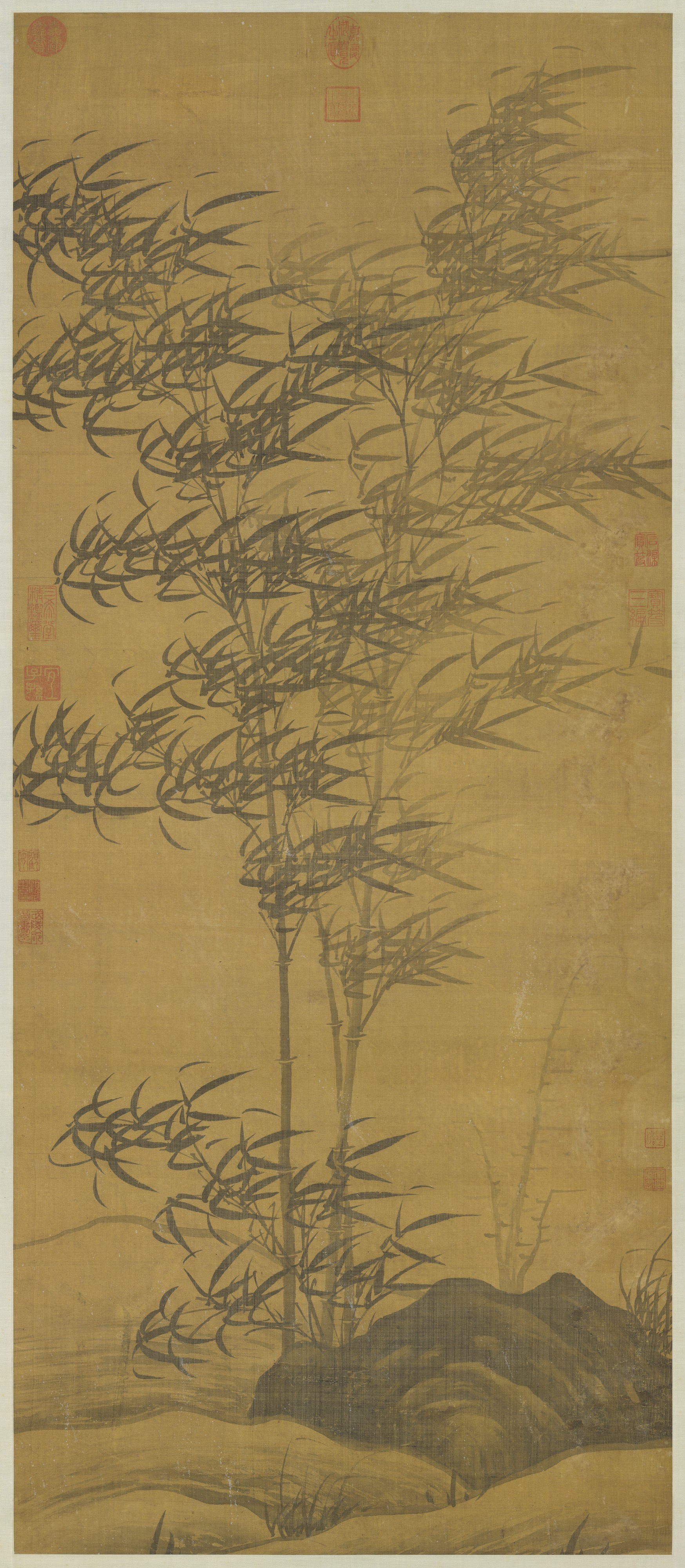 顧安(1289-1365),字定之,平江(今江蘇蘇州)人。師法畫竹名家文同與趙孟頫,擅長風竹,自成面貌。元代墨竹承續宋代文同,不僅把握寫實性,將書法筆意融入,書畫一體,在畫竹技巧上更有創意,風格更為多樣化。顧安風竹很受世人推崇,用筆遒勁,充滿生機,為元代畫竹的代表人物。 此幅繪墨竹三枝,畫中竹葉都向同一方向翻飛,葉片在勁風吹拂下,飛揚搖曳,彷彿可以聽到呼嘯的風聲和葉片摩擦的聲音,動感十足。畫筆撇出竹葉正反向背,加以濃淡的墨韻下,畫中景彷彿有了一層淡淡霧氣,枝葉的結構和層次處理前後遠近,運用極為生動。前景坡石結合披麻皴和水墨暈染濃淡變化豐富,使構圖簡練的幾竿竹子,在畫面形成了空間縱深感。此幅佈局筆墨精妙之外,又讓人有置身風中的實境感。畫竹雖以抒發胸中逸氣為標榜,本幅剛直秀勁中又有婀娜溫婉之意,畫趣畫理兼具,是傳世顧安風竹之精品。