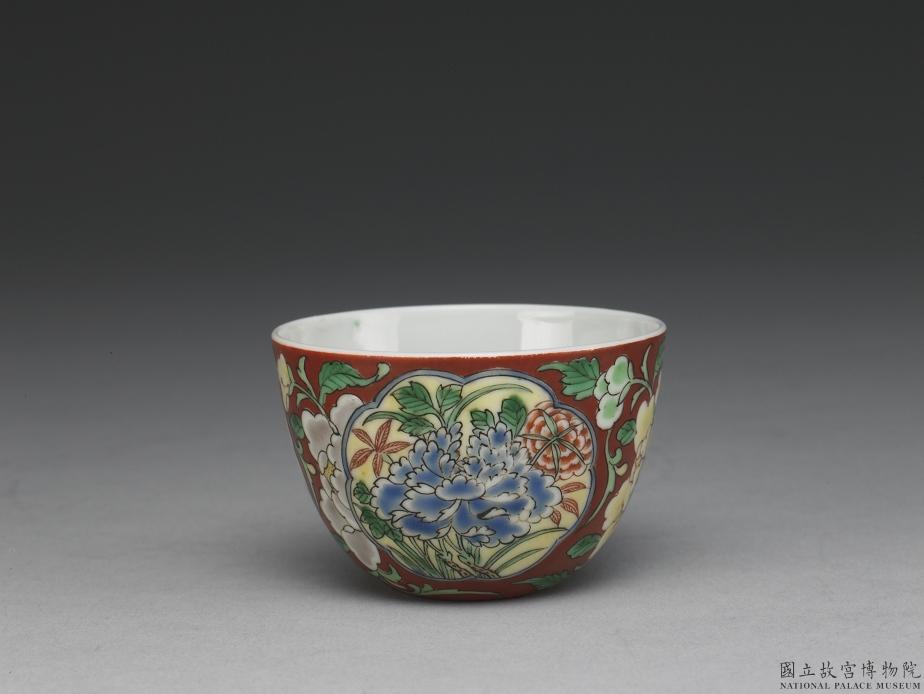 生產於景德鎮的洋彩瓷,風格類似琺瑯彩瓷,亦屬官窯名品。此器器內無紋,外壁以紅釉為地,間飾三個八花口開光,開光內以淡黃釉為地,分別繪以折枝牡丹、二色菊花和月季雛菊,開光之間並間飾黃、綠、紫各色花朵。器底帶「雍正御製」二行青花楷書雙方框款。可對照陳設檔案史料,益顯珍貴。