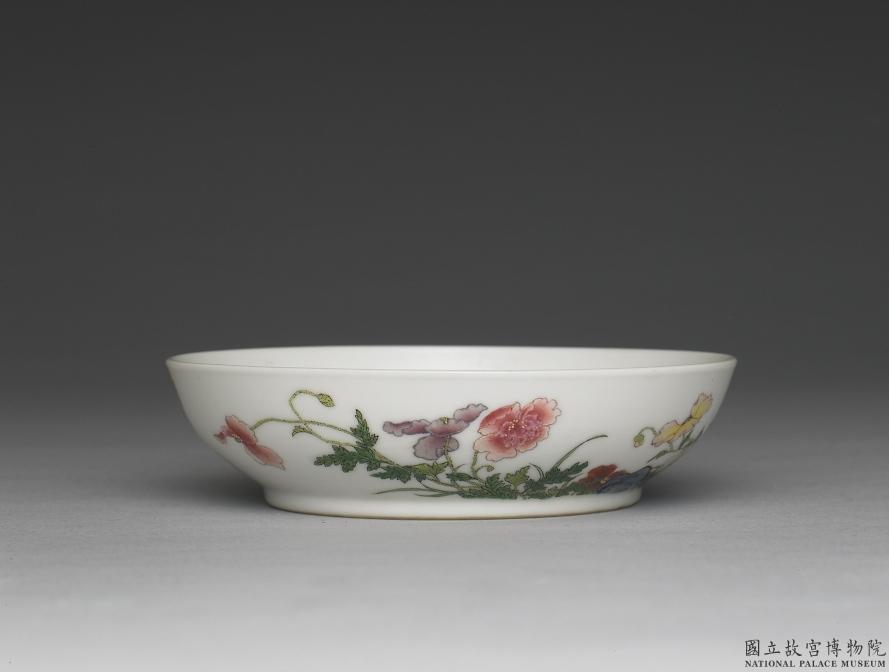 生產於宮中造辦處的琺瑯彩瓷,是盛清代表工藝之一。製作精美,傳世數量稀少,紋飾、題材縱有成對,亦無一相同,乾隆朝時便曾降旨分批珍藏。 此二器器內無紋,器外壁一面各自彩繪黃、白、粉、紫、黃顏色相殊的虞美人花十朵,另一面各自墨書「宿雨那經舞袖垂」、「迎風似逐歌聲起」詩句。詩句前有「佳麗」,後有「金成」、「旭映」共三枚紅料印。器底帶「雍正年製」二行藍料宋體字雙方框款。 雍正朝是琺瑯彩瓷發展的關鍵階段,此器品質精美,繪製細膩,紋樣呈現出與郎世寧〈畫仙萼長春〉冊相通之處,反映當時流通異質材間的宮廷品味。傳世僅有二件,且能對照陳設檔案史料,益顯珍貴。