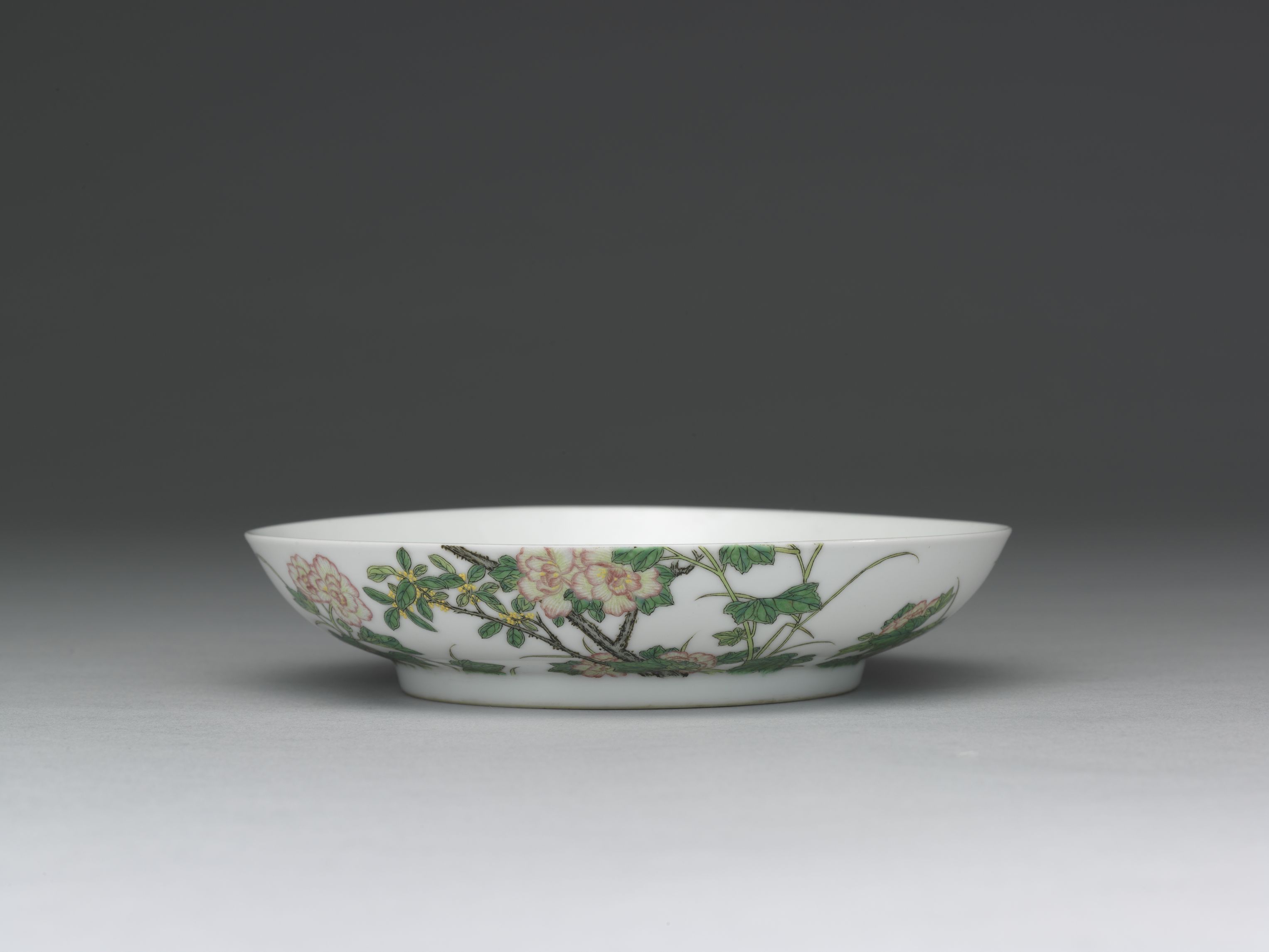 生產於宮中造辦處的琺瑯彩瓷,是盛清代表工藝之一。製作精美,傳世數量稀少,紋飾、題材縱有成對,亦無一相同,乾隆朝時便曾降旨分批珍藏。 此二器成對,器內無紋,器外壁一面彩繪桂花一株,芙蓉數棵,其中一碟佈局以桂花始,一碟以桂花終,畫面相互對稱。另一面墨書「枝生無限月,花滿自然秋」詩句,詩句前有「佳麗」,後有「金成」、「旭映」共三枚紅料印。器底帶「雍正年製」二行藍料宋體字雙方框款。 雍正朝是琺瑯彩瓷發展的關鍵階段,此器品質精美,繪製細膩,紋樣結合詩書畫印,展現雍正皇帝的高雅品味。傳世僅有二件,且能對照陳設檔案史料,益顯珍貴。