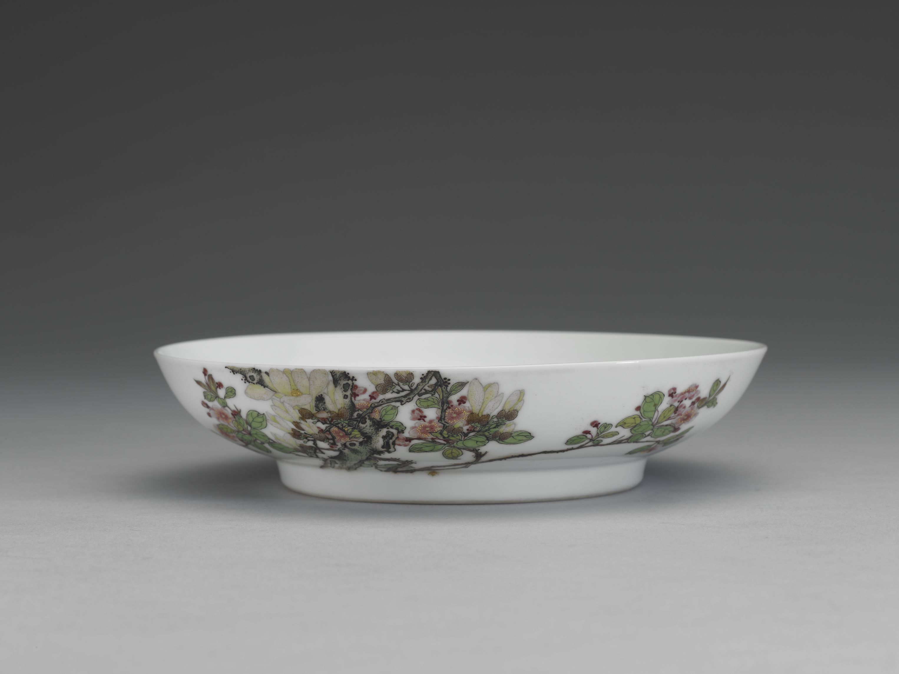 生產於宮中造辦處的琺瑯彩瓷,是盛清代表工藝之一。製作精美,傳世數量稀少,紋飾、題材縱有成對,亦無一相同,乾隆時便曾降旨分批珍藏。 此二器成對,器內無紋,器外壁彩繪粉色海棠及白色玉蘭,其中一件構圖以海棠始,另一件以木蘭始,佈局大體相同而細節各有變化。另一面墨書「影轉團團月,香含細細風」詩句,詩句前有「佳麗」,後有「碧霞」、「旭映」共三枚紅料印。器底帶「雍正年製」二行藍料宋體字雙方框款。 雍正朝是琺瑯彩瓷發展的關鍵階段,此器品質精美,繪製細膩,紋樣結合詩書畫印,展現雍正皇帝的高雅品味。傳世僅有二件,且能對照陳設檔案史料,益顯珍貴。