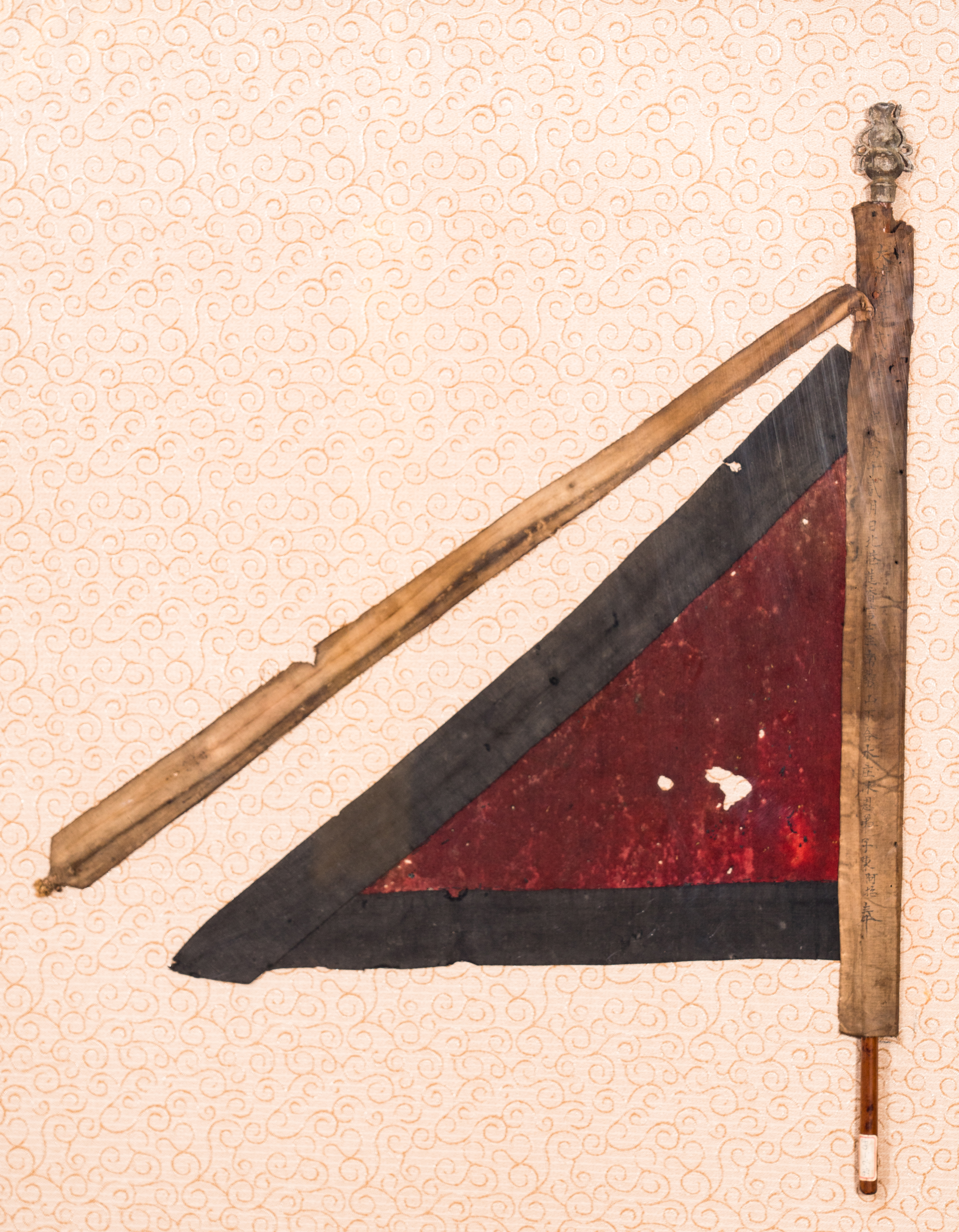 紅色三角旗滾藍邊,旗管處書寫「大清道光二十六年歲次丙午貳月往北港進香南廂堡下合水庄沐恩弟子陳阿招奉」
