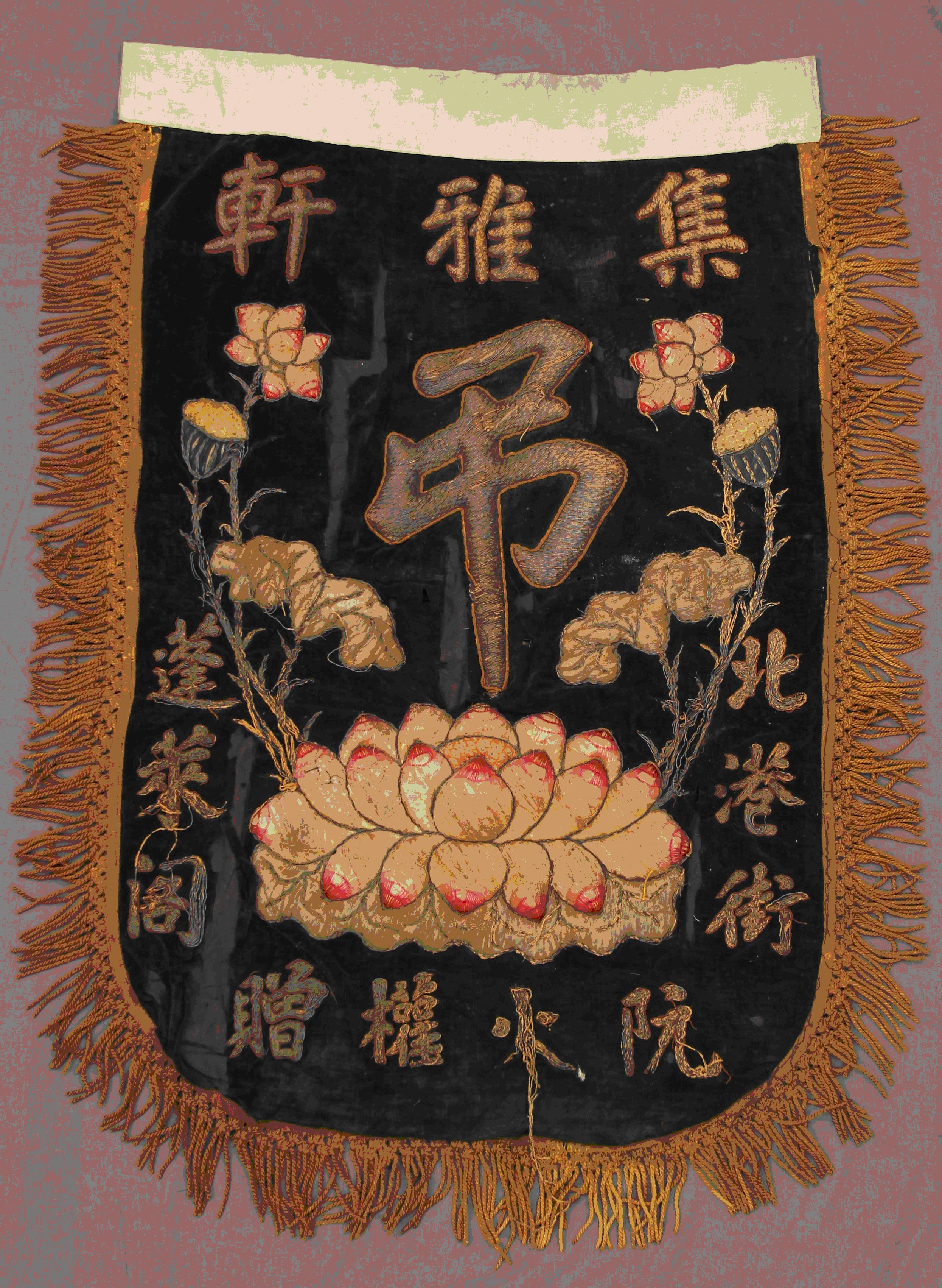1、本件弔喪旗反映日治時代北港地區特殊的喪葬習俗。 2、該旗署名者阮火權為北港仕紳,蓬萊閣為其開設之酒家,反映北港日治時代人脈關係。 3、旗上有鋪綿繡、平繡、金蔥線,具有日治時期風格與工藝。 4、傳世弔喪旗相當罕見,具備一定稀有性。