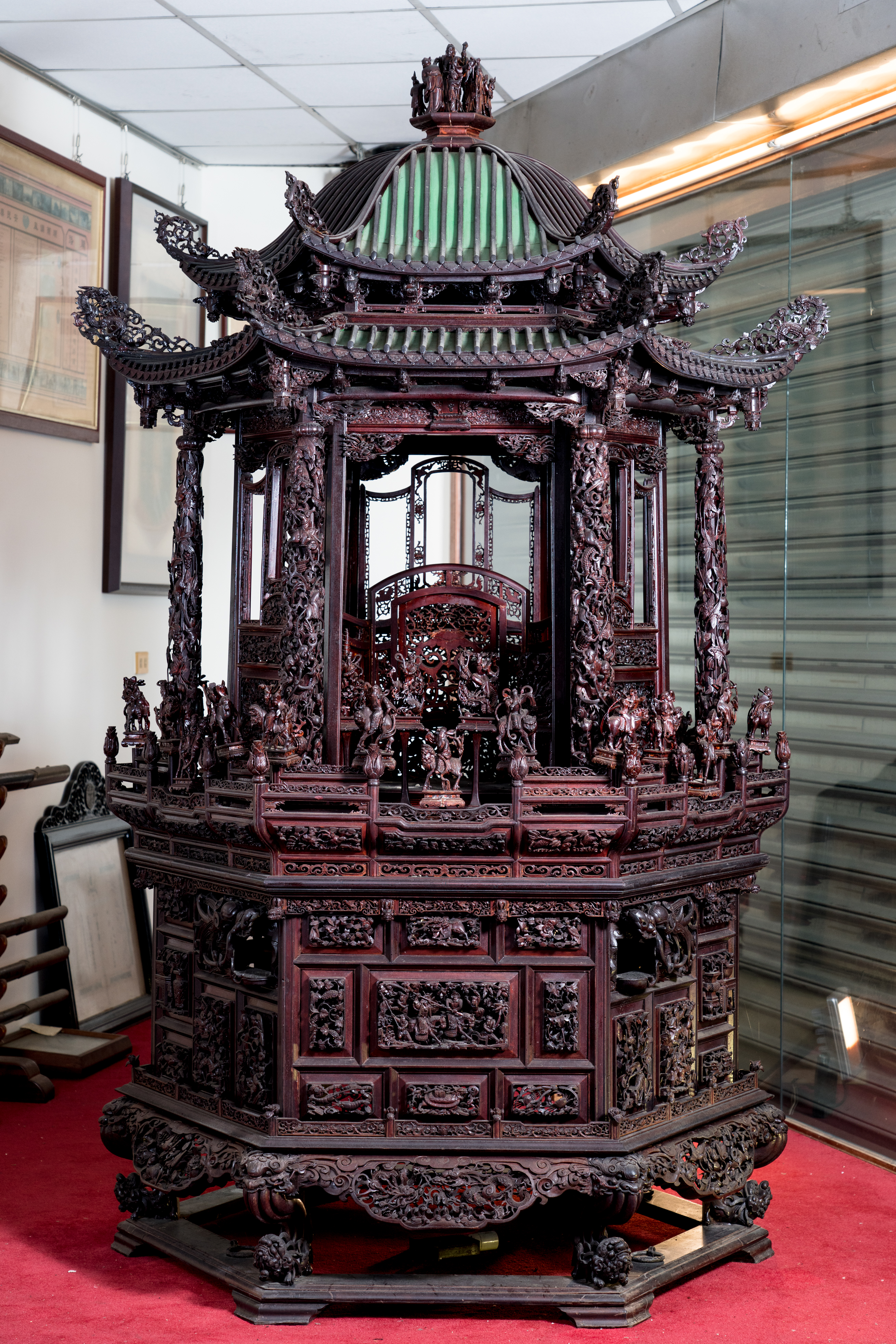 北港朝天宮祖媽會(金順盛)相傳成立於1910年(明治43年)年前後,為迎請祖媽出巡,當時會長許致集十二家郊行之捐款,禮聘當時正在北港朝天宮主持改建工程的陳應彬設計雕刻此轎,以祖媽像的尺度量身訂做,費時三年,約在1912年(明治45年)完工。 神轎曾於1915年(大正4年)以「參考品(提供其他業者參考的展示品)」資格送往嘉義參加第二屆南部物產共進會,獲得「記念賞牌(參考品之優秀者)」,該獎牌為目前見證神轎歷史的佐證資料之一。 神轎製作上極為精緻。有別有朝天宮既有四邊形轎子,轎身選擇以構造難度甚高的六角形施作。兩根轎棍懸吊四個支點,如何平穩的吊起六角形的重物,且讓搭接處不至於分離,為承作司阜必須解決的問題。神轎立面依常見的寺廟建築形制作分割,包含轎頂、轎身、轎裙、轎腳等,各作精緻的雕割,基本上無一處簡化者,就連轎棍都施以金屬構件包覆,其用心程度可見一般。轎身鑿花與木雕中更含有陳應彬著名的螭虎團字「北港朝天宮」字樣,媽祖座前鑲有四海龍王的木雕像,周圍環繞二十四司,象徵眾神共隨媽祖出巡,彰顯媽祖地位之尊榮,實屬台灣傳統工藝大成表現。 在1960年代第二代六角祖媽轎完成之前,此神轎均是北港朝天宮媽祖遶境最重要的神聖核心與視覺焦點。 (蔡侑樺老師提供)
