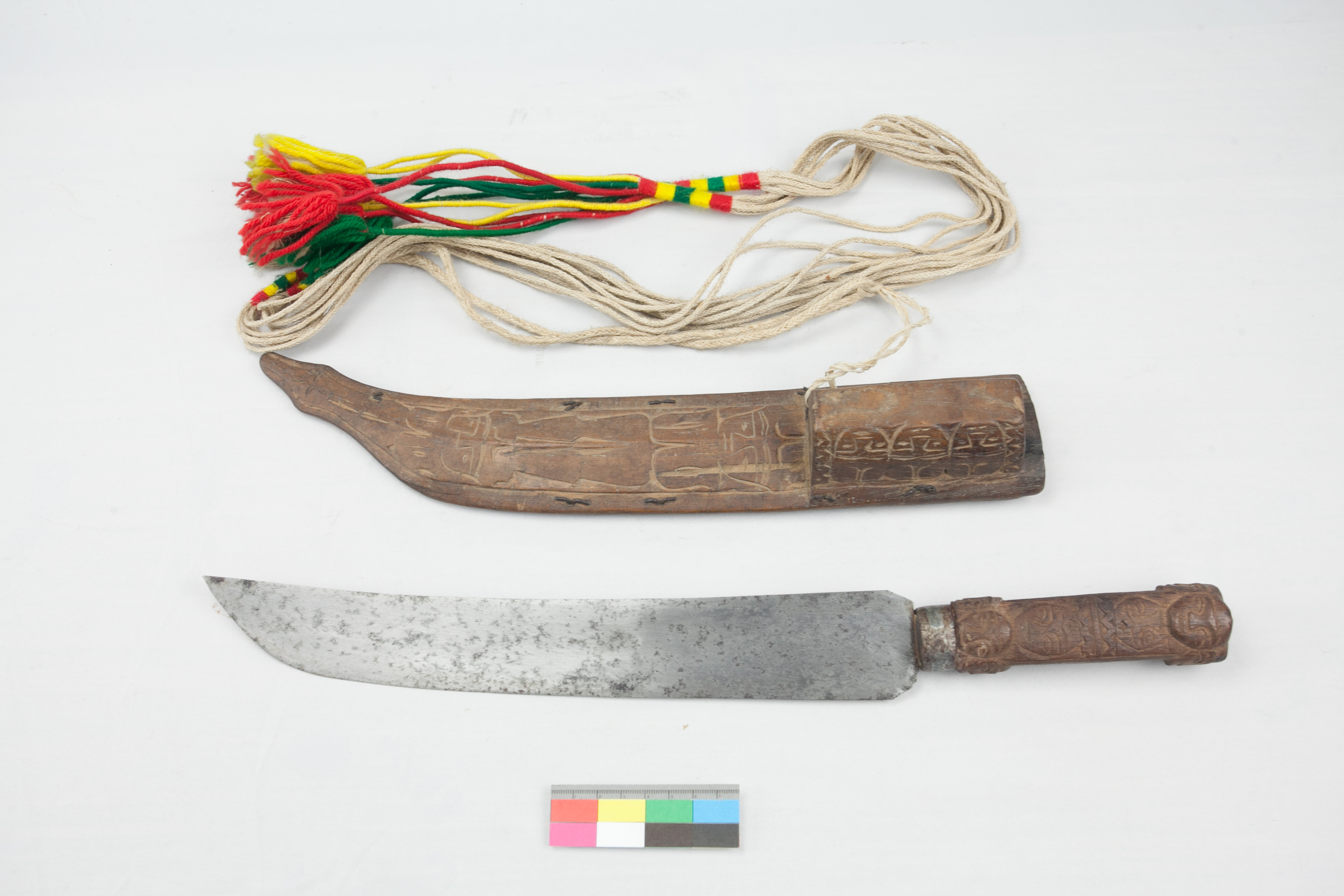 1.完成年代與沿革簡述 「工作刀 Katakitan」完成年代不詳。一般來說,排灣族及魯凱族工作刀的刀柄底部會預留空洞,獵人上山時會就地取材,撿取附近的樹枝或竹子,將其中一端削成適當的大小後,塞入工作刀刀柄的空洞,讓工作刀變成長矛。如此一來,可以確保獵人在狩獵時與獵物保持一定的距離,降低受傷的機率。 2.與文物相關的重要人物 由於工作刀為排灣族及魯凱族獵人出門狩獵必備的工具,因此可以推測此古物過去的持有者可能為排灣族或魯凱族的獵人。 3.古物尺寸(長、寬、高等)與材質 「工作刀 Katakitan」長51公分、寬6.5公分,刀鞘與刀柄的材質為臭臘木,刀身為鐵。 4.外觀特徵描述 「工作刀 Katakitan」的顏色是以原木色調為主。刀柄雕刻的題材及雕刻手法,採用陽刻與陰刻混合的人頭紋飾。刀鞘末端彎轉如百步蛇形,中間處雕刻兩直立人像圖,淺浮雕,上方人像較大於下方人像。刀鞘近柄處有護手突起,雕刻人頭紋和百步蛇紋。整體木雕紋飾簡單並寫實。