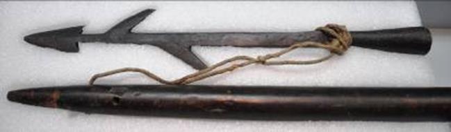 本件為脫槍頭式狩獵用,桿身頂端有倒勾的鐵槍鏃與之相連,其用法為使用手擲方式射向獵物,當擲中目標時,鐵製倒勾槍頭讓狂奔的野獸無法脫離,槍頭與木桿成一直線,當野獸逃入森林時,藉由木桿卡在樹林的原理,使獵人順勢捕獲獵物。此脫鏃鏢由長木桿及鐵件組合而成,兩者間以麻繩串連之,鐵件以手工打造而成,成一魚叉狀。木桿有黑色塗裝,目前已脫落,為手工刨製而成,兩端略呈元尖稍形。