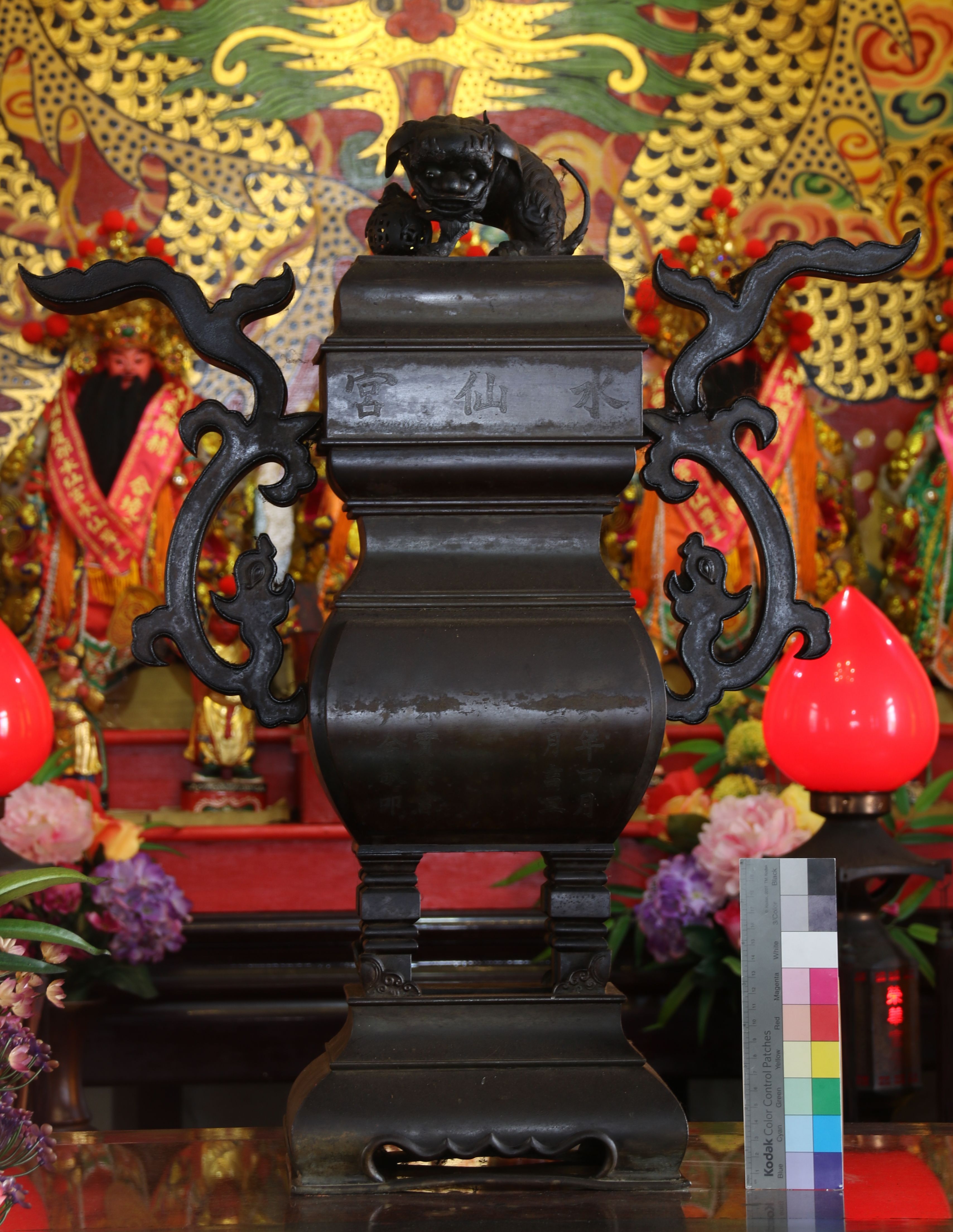 方形展耳供器,凸蓋頂平,上飾一立體戲球獅飾;直口豎頸,身處中鼓,平底有四足,足下另有一座,兩側展耳與蓋同高。直口處正面鏨刻「水仙宮」,身處鏨刻落款,左題「昭和六年四月辛未三月吉旦」,右題「臺廈郊實業會眾鋪同敬叩」;雙耳為捲草龍紋,四直足下有波紋,下座足間飾壼門,器底有二圓印款「勝春」。