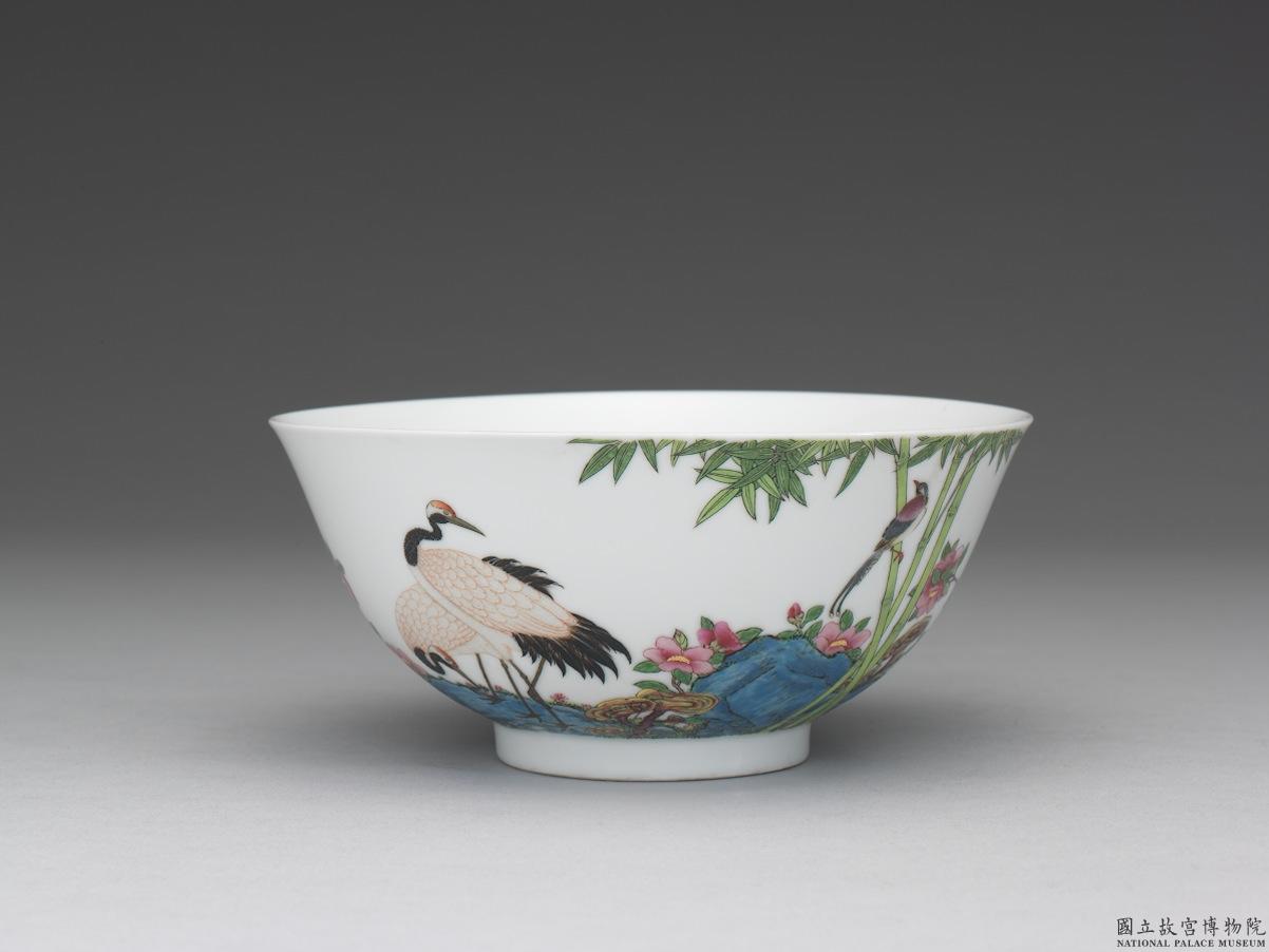 生產於宮中造辦處的琺瑯彩瓷,是盛清代表工藝之一。製作精美,傳世數量稀少,紋飾、題材縱有成對,亦無一相同,乾隆朝時便曾降旨分批珍藏。 兩器外壁彩繪藍色奇石一座,兼有竹、靈芝及茶花,並有丹頂鶴一低首一抬頭、綬帶鳥一停駐竹間一飛舞空中,兩器圖樣左右幾乎對稱,另一面墨書「睡輕旋覺松花落,舞罷閒聽澗水流」詩句,詩句前有「鳳采」,後有「彬然」、「君子」共三枚紅料印。器底帶「雍正年製」二行藍料宋體字雙方框款。 雍正朝是琺瑯彩瓷發展的關鍵階段,此器品質精美,繪製細膩,紋樣可對照清郎世寧〈畫花陰雙鶴〉,又結合詩書畫印,展現雍正皇帝的藝術品味。傳世僅有二件,且可對照道光十五年乾清宮《琺瑯玻璃宜興磁胎陳設檔案》,益顯珍貴。