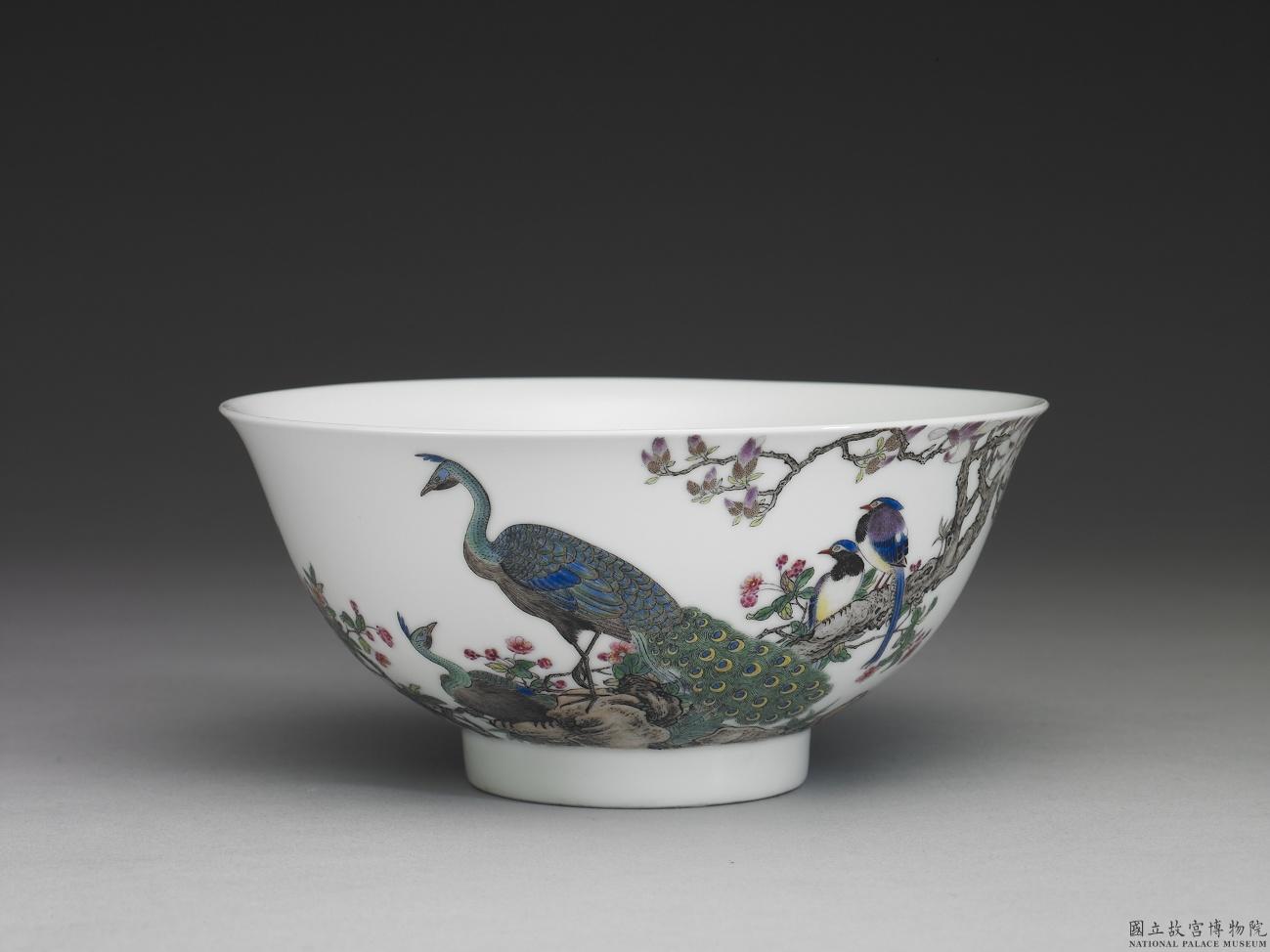 生產於宮中造辦處的琺瑯彩瓷,是盛清代表工藝之一。製作精美,傳世數量稀少,紋飾、題材縱有成對,亦無一相同,乾隆朝時便曾降旨分批珍藏。 兩器外壁彩繪以翠竹始,繼之繪白玉蘭,而以粉色海棠終。中央的藍色奇石上,有孔雀、綬帶鳥及鵲鳥。外壁另一面墨書「動搖金翠尾,飛舞玉池陰」詩句。詩句前有「政化」,後有「昇平」、「奕世」共三枚紅料印。器底帶「雍正年製」二行藍料宋體字雙方框款。 雍正朝是琺瑯彩瓷發展的關鍵階段,此器品質精美,繪製細膩,紋樣可對照清郎世寧〈畫孔雀開屏〉、〈畫仙萼長春〉冊,又結合詩書畫印,展現雍正皇帝的藝術品味。傳世僅有二件,且可對照雍正十二年造辦處檔案,和道光十五年乾清宮《琺瑯玻璃宜興磁胎陳設檔案》,益顯珍貴。