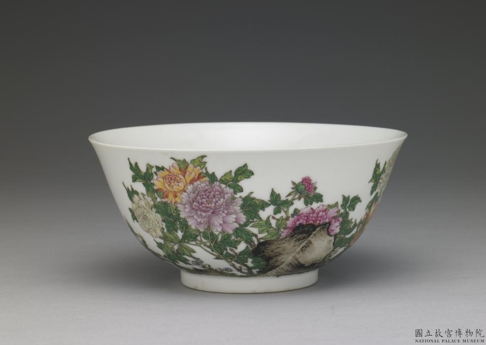 生產於宮中造辦處的琺瑯彩瓷,是盛清代表工藝之一。製作精美,傳世數量稀少,紋飾、題材縱有成對,亦無一相同,乾隆朝時便曾降旨分批珍藏。 兩器外壁彩繪紫、粉、橘、白各色盛放牡丹,另一面墨書「嫩蕊包金粉,重葩結繡雲」詩句,詩句前有「佳麗」,後有「金成」、「旭映」共三枚紅料印。器底帶「雍正年製」二行藍料宋體字雙方框款。 雍正朝是琺瑯彩瓷發展的關鍵階段,此器品質精美,繪製細膩,紋樣結合詩書畫印,展現雍正皇帝的藝術品味。傳世僅有二件,且可對照雍正十二年造辦處檔案,和道光十五年乾清宮《琺瑯玻璃宜興磁胎陳設檔案》,益顯珍貴。