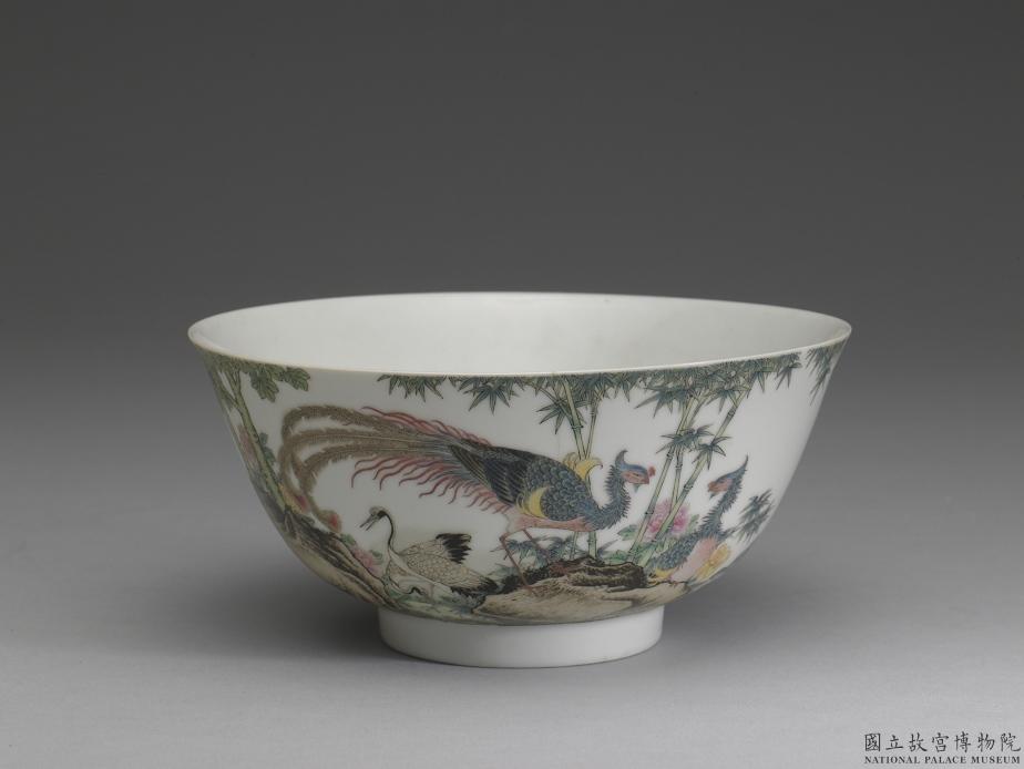 生產於宮中造辦處的琺瑯彩瓷,是盛清代表工藝之一。製作精美,傳世數量稀少,紋飾、題材縱有成對,亦無一相同,乾隆朝時便曾降旨分批珍藏。 兩器外壁一面繪有奇石、梧桐、牡丹、矮竹,其上並有鳳凰、鳴鶴、鴛鴦、鶺鴒、黃鸝各一對,另一面墨書「盛世鳳凰應紀曆,羽儀四佐協綱常」詩句,詩句前有「鳳采」,後有「彬然」、「君子」共三枚紅料印。器底帶「雍正年製」二行藍料宋體字雙方框款。 雍正朝是琺瑯彩瓷發展的關鍵階段,此器品質精美,繪製細膩,紋樣結合詩書畫印,展現雍正皇帝的藝術品味。傳世僅有二件,且可對照道光十五年乾清宮《琺瑯玻璃宜興磁胎陳設檔案》,益顯珍貴。