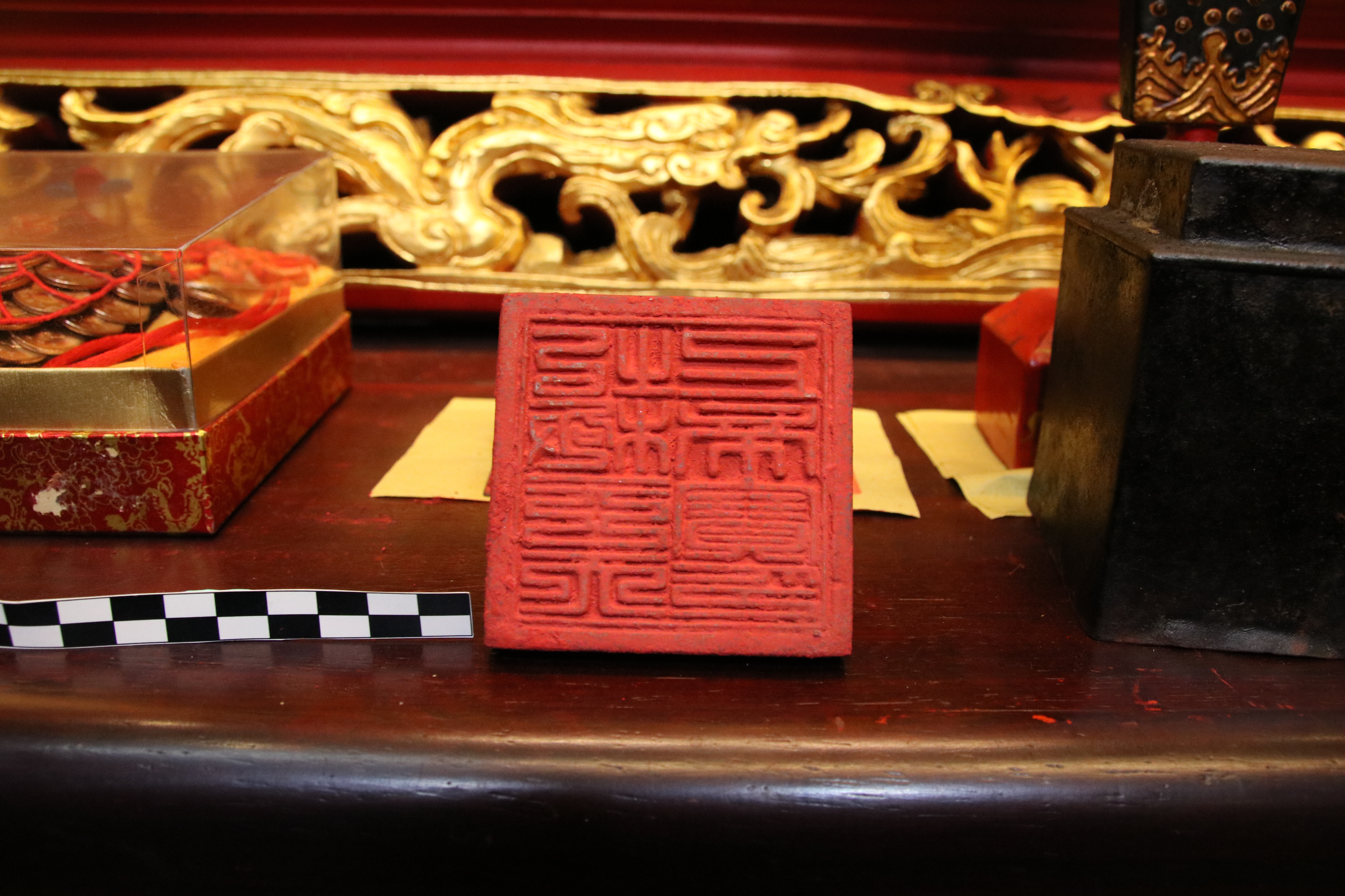 本方形寶印為一組3件,分為上、下寶印盒及寶印。印背上有銘文「北極殿」、「大正壬戌春月吉旦」、「爐下弟子藍木敬獻」,印面陽刻方篆「北極玄天上帝寶印」。