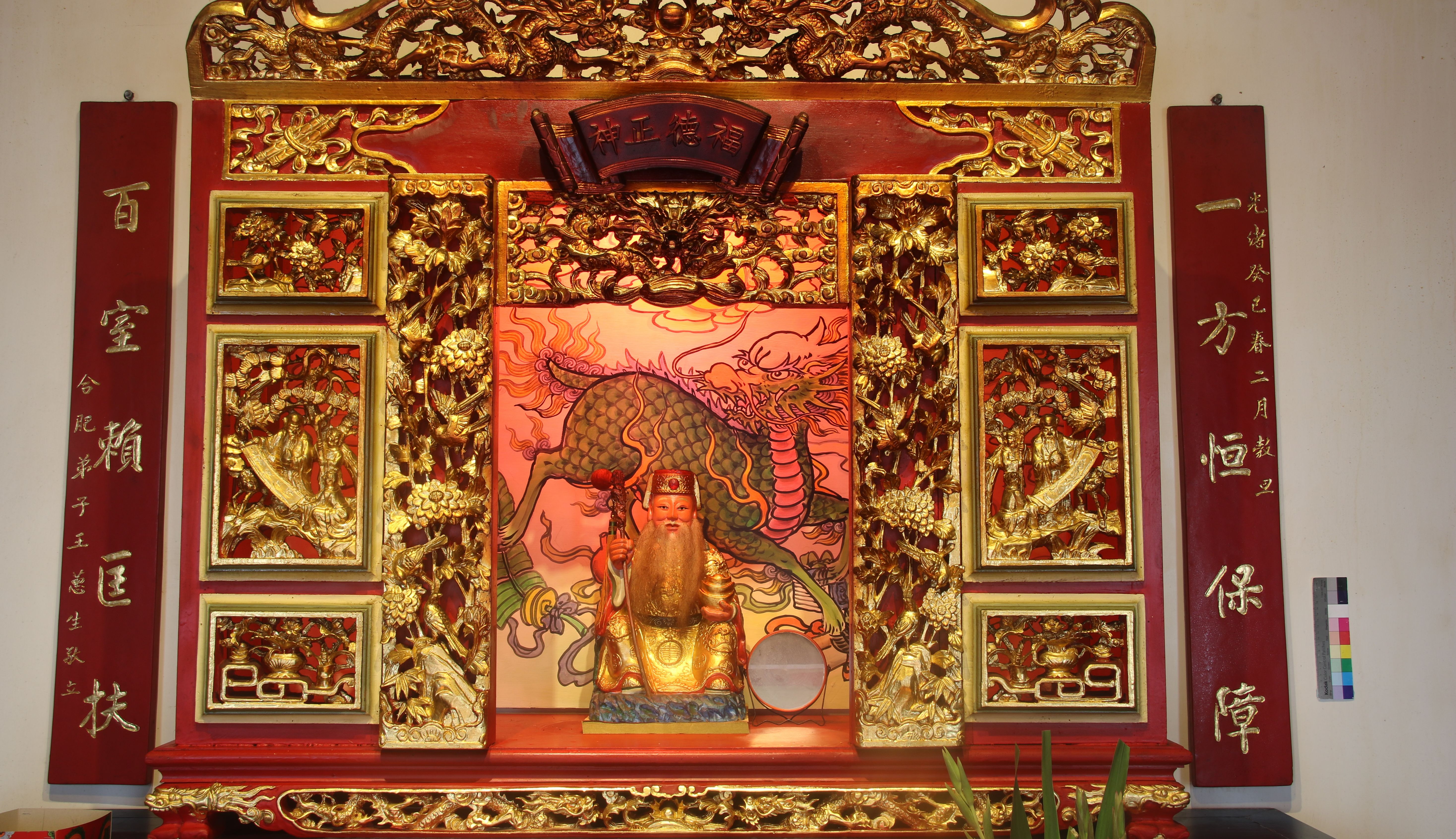 直長型平面楹聯,聯施紅漆,字為陰刻勾邊淺陰刻,楷書貼金,上下聯「一方恒保障,百室賴匡扶」,上下款「光緒癸巳春二月穀立」、「合肥弟子王蕙生敬立」。