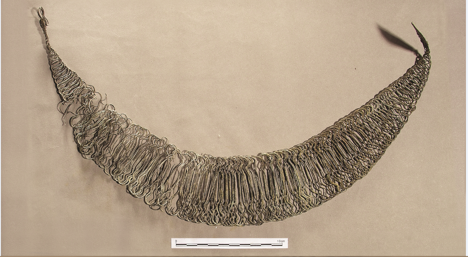 長38公分、寬6.7公分、厚1.2公分、重83.3克,銅製,以3條金屬線一端對折為3個套環作為一端,同時形成6股線後開始編織,以不間斷的帶波浪U字型曲繞彎折形成魚身,其波浪彎曲的層層形狀櫛比鱗次或如魚鱗,而每條金屬線彼此相扣相連,收尾時固定於一片三角形金屬片上,尾部翹高0.62公分。