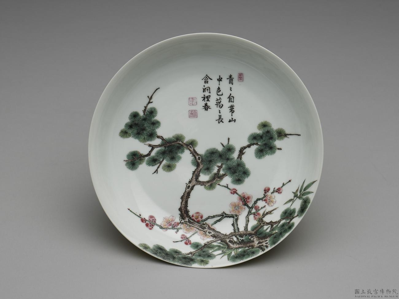 生產於宮中造辦處的琺瑯彩瓷,是盛清代表工藝之一。製作精美,傳世數量稀少,紋飾、題材縱有成對,亦無一相同,乾隆朝時便曾降旨分批珍藏。此器外壁滿施黃釉,盤心由右下斜伸松樹一株,其後並伴有紅梅、翠竹。松樹之上以墨書寫有「青青自帶山中色,藹藹長含洞裡春」詩句,詩句前有「鳳采」,後有「壽古」、「香清」共三枚紅料印。器底帶「大清雍正年製」二行青花楷書雙圈款。 雍正朝是琺瑯彩瓷發展的關鍵階段,此器品質精美,繪製細膩,紋樣結合詩書畫印,展現雍正皇帝的藝術品味,且可對照道光十五年乾清宮《琺瑯玻璃宜興磁胎陳設檔案》,益顯珍貴。