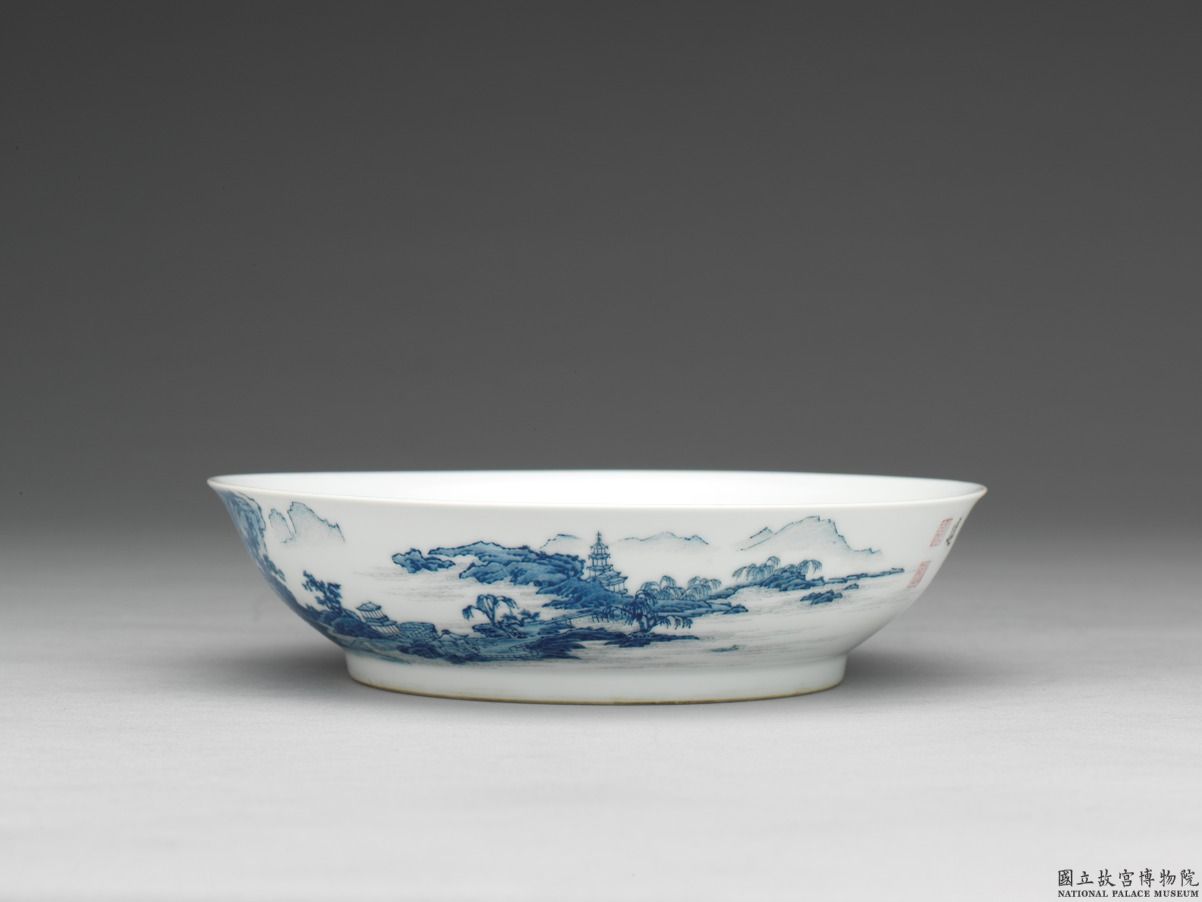 此器侈口、淺壁、圈足,胎骨極薄。器內無紋,器外壁一面以較濃重的藍料畫山渚群山,樓閣層樹。外壁一面以墨書「樹接南山近,烟含北渚遙」詩句,詩句前有「壽如」,後有「山高」、「水長」共三枚紅料印。器底帶「雍正年製」二行藍料宋體字雙方框款。雍正朝以青山水為飾的琺瑯彩瓷由檔案來看有盤、碗、茶壺、酒圓、茶圓等,雍正皇帝十分喜愛此類作品,不僅希望多燒造,也多次對繪製圖樣的畫琺瑯人鄒文玉加薪鼓勵。