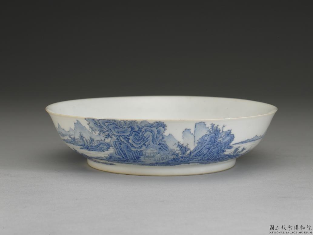 此器侈口、淺壁、圈足,胎骨極薄。器內無紋,器外壁一面以藍料畫山水樓閣,山勢俊秀巍峨,水面煙波浩渺,屋舍樹叢,船浦小橋,盡皆細筆描繪。外壁另一面以墨書「樹接南山近,烟含北渚遙」詩句,詩句前有「壽如」,後有「山高」(白文)、「水長」共三枚紅料印。器底帶「雍正年製」二行藍料宋體字雙方框款。