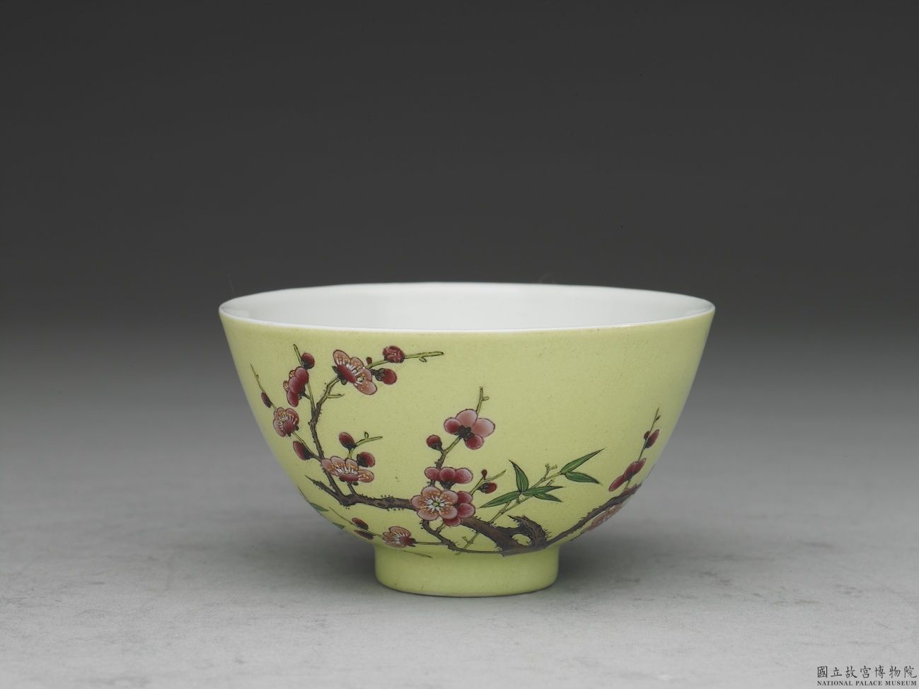 生產於宮中造辦處的琺瑯彩瓷,是盛清代表工藝之一。製作精美,傳世數量稀少,紋飾、題材縱有成對,亦無一相同,乾隆朝時便曾降旨分批珍藏。 此二器外壁施淺綠地,其上彩繪生機勃發的紅梅一株及早春新綠的細柳三條;另一面墨書「粧面迴青鏡,歌塵起畫梁」詩句,詩句前有「先春」,後有「壽古」(白文)、「君子」共三方朱文印。器底帶「雍正年製」二行藍料宋體字雙方框款。 雍正朝是琺瑯彩瓷發展的關鍵階段,此器品質精美,繪製細膩,紋樣結合詩書畫印,展現雍正皇帝的藝術品味。傳世僅有二件,且可對照道光十五年七月十一日立乾清宮《琺瑯玻璃宜興磁胎陳設檔案》,益顯珍貴。