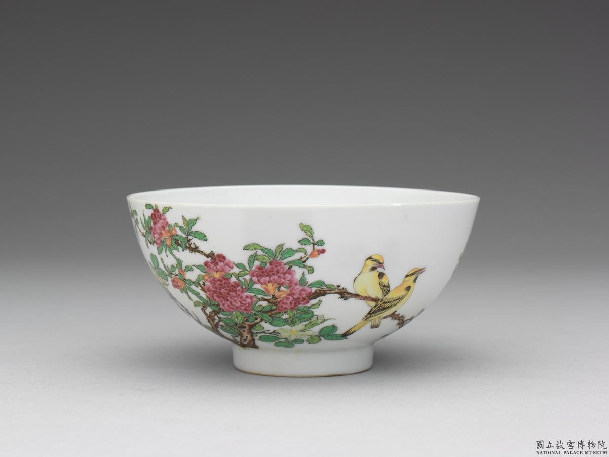 生產於宮中造辦處的琺瑯彩瓷,是盛清代表工藝之一。製作精美,傳世數量稀少,紋飾、題材縱有成對,亦無一相同,乾隆朝時便曾降旨分批珍藏。 此二器外壁彩繪石榴、刺梅花,上棲黃鸝一對;一面有墨書「新枝含淺綠,曉萼散輕紅」二句,詩句前有「佳麗」,後有「金成」、「旭映」共三枚紅料印。器底帶「雍正年製」二行藍料宋體字雙方框款。 雍正朝是琺瑯彩瓷發展的關鍵階段,此器品質精美,繪製細膩,紋樣可對照清 郎世寧〈畫仙萼長春〉冊,反映當時流通異質材間的宮廷品味。傳世僅有二件,且能對照道光十五年七月十一日立乾清宮《琺瑯玻璃宜興磁胎陳設檔案》,益顯珍貴。