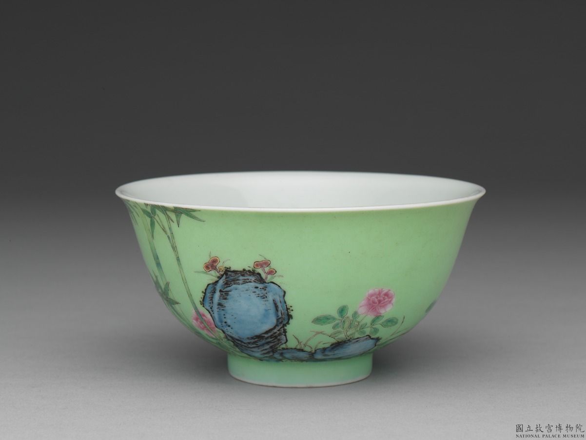 生產於宮中造辦處的琺瑯彩瓷,是盛清代表工藝之一。製作精美,傳世數量稀少,紋飾、題材縱有成對,亦無一相同,乾隆朝時便曾降旨分批珍藏。 此二器外壁以綠色為地,一面彩繪奇石一座,其旁開有靈芝、月季、脩竹及野菊;另一面墨書「朝朝籠麗月,歲歲占長春」二句,詩句前有「佳麗」,後有「旭映」、「君子」共三枚紅料印。器底帶「雍正年製」二行藍料宋體字雙方框款。 雍正朝是琺瑯彩瓷發展的關鍵階段,此器品質精美,繪製細膩,紋樣結合詩書畫印,展現雍正皇帝的藝術品味。傳世僅有二件,且可對照道光十五年七月十一日立乾清宮《琺瑯玻璃宜興磁胎陳設檔案》,益顯珍貴。