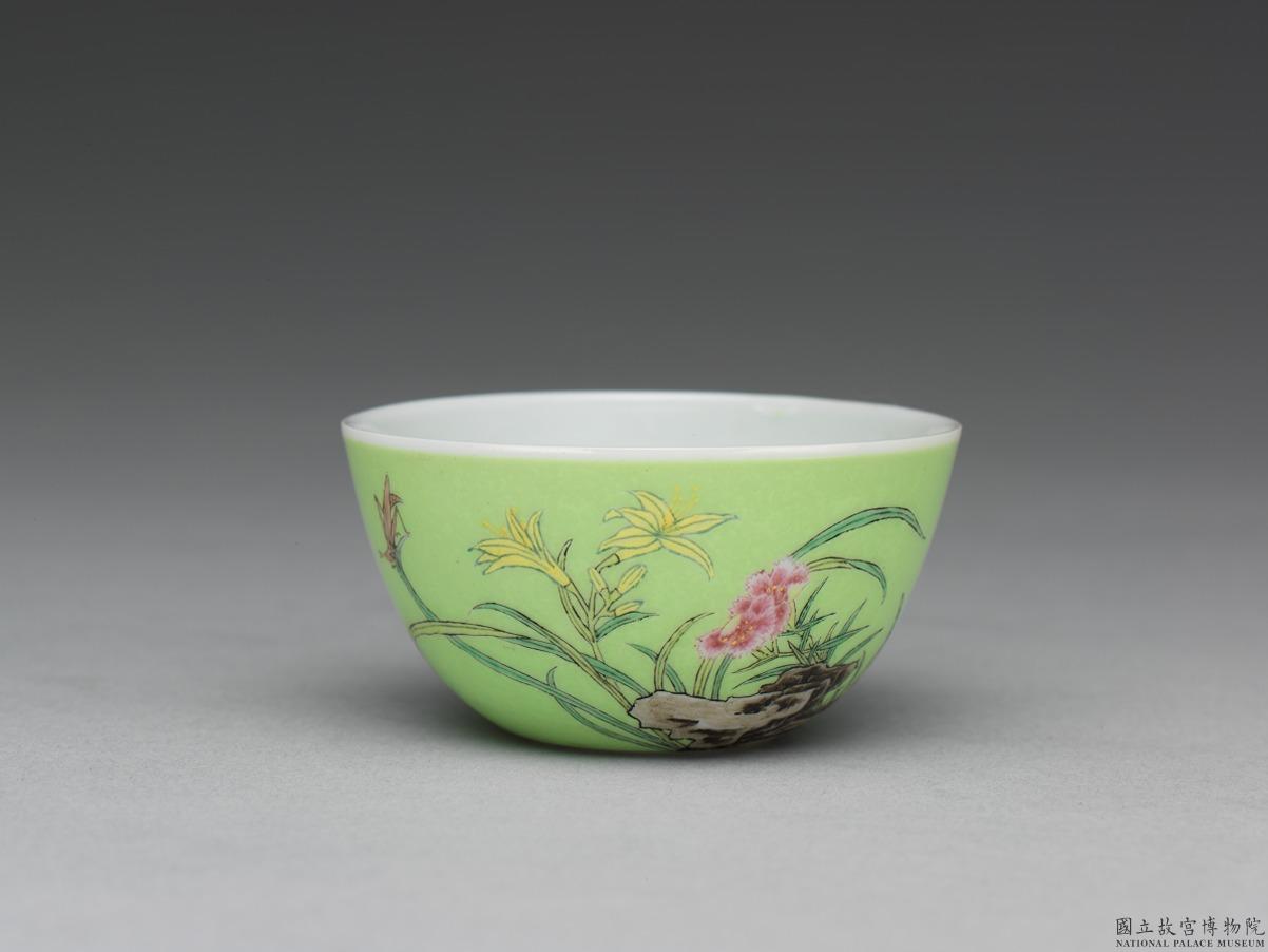 生產於宮中造辦處的琺瑯彩瓷,是盛清代表工藝之一。製作精美,傳世數量稀少,紋飾、題材縱有成對,亦無一相同,乾隆朝時便曾降旨分批珍藏。 此器外壁以綠釉為地,一面彩繪一赭色湖石,石後盛開剪秋羅及萱花,萱草葉上帶有蚱蜢;另一面墨書「香傳少女風」一句,詩句後有「佳麗」一枚紅料印,器底帶「雍正年製」二行藍料宋體字雙方框款。 雍正朝是琺瑯彩瓷發展的關鍵階段,此器品質精美,繪製細膩。傳世僅有一件,且可對照道光十五年七月十一日立乾清宮《琺瑯玻璃宜興磁胎陳設檔案》,益顯珍貴。