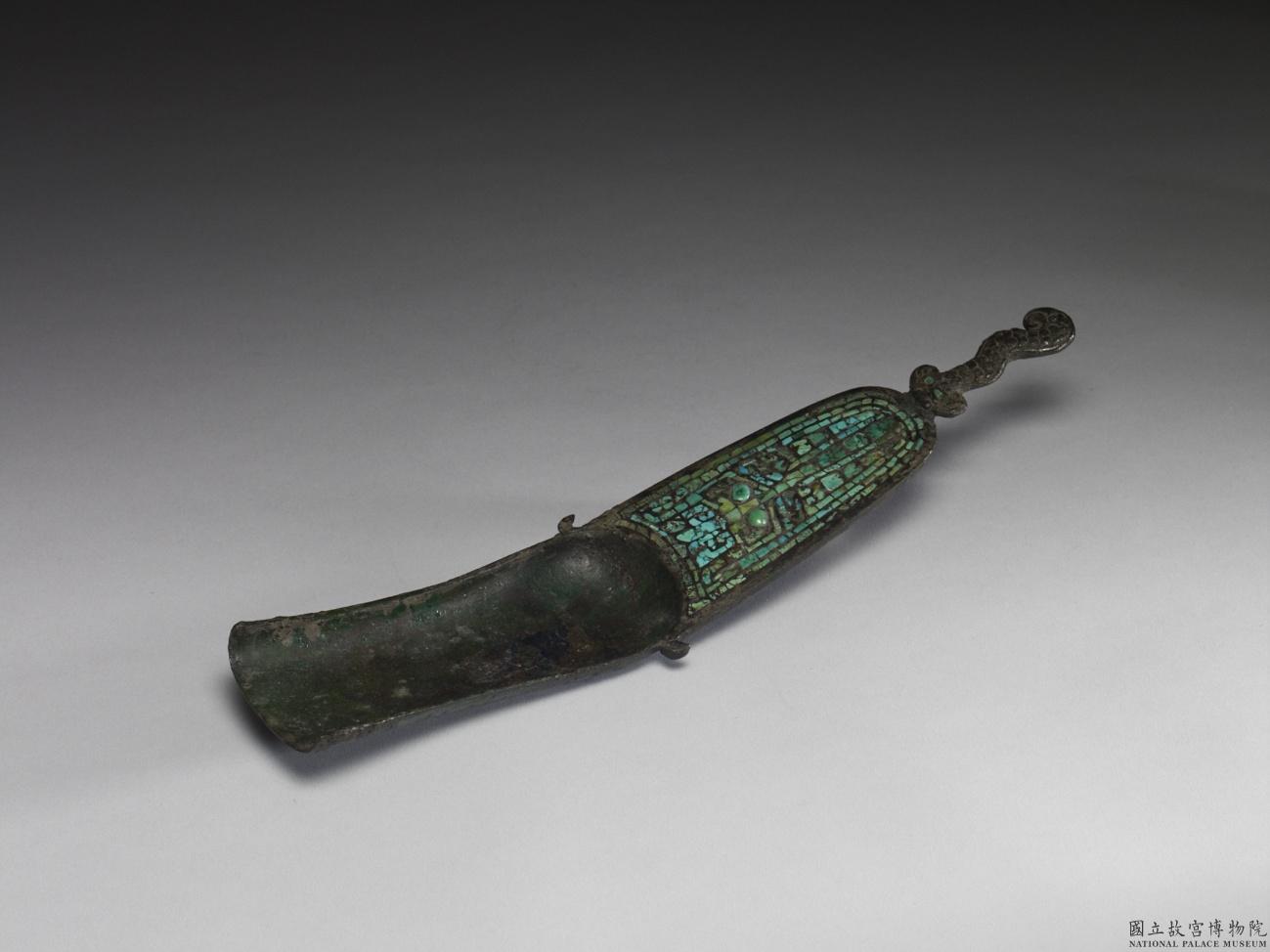 此器作素面長畚箕形,造形相當罕見,未見於考古出土。柄部帶有細緻的綠松石獸面鑲嵌。獸面型態與中央研究院歷史語言研究所藏西北崗2017號馬坑出土之<商晚期鑲嵌綠松石獸面>(R001195)相近,應為同一時期的作品。 本件綠松石鑲嵌工藝及紋飾主題雖見於晚商時期青銅器,但器形非中原地區商王朝所習見,可能是外來文化影響下的產物,表現出商晚期的文化多元性。