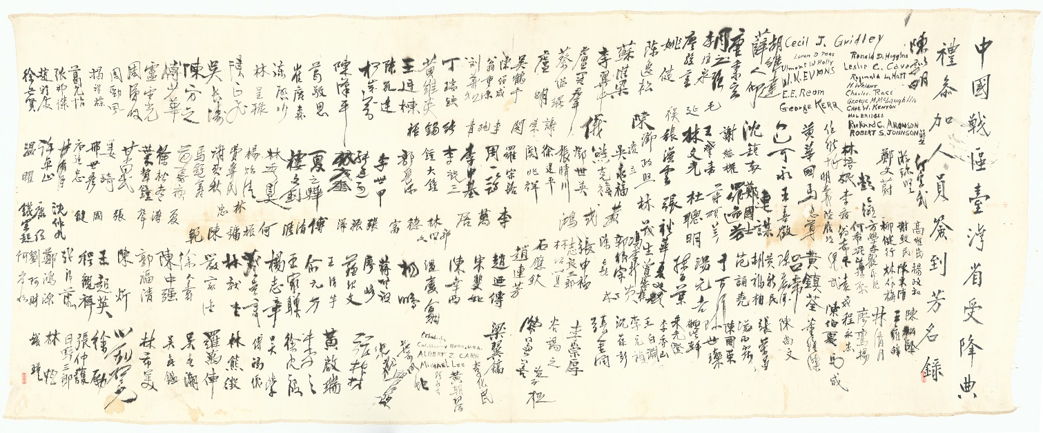 本文物凡10件(卷),共721頁與綾布1塊。其中134000000003C芳名錄的材質為綾布,真絲材質布面,長179公分寬72公分。134000000237A簽名簿的材質為紙質,左翻蝴蝶摺頁,長27公分寬18公分。其餘8件(卷)的材質為紙質,尺寸分別為長29.5公分寬21公分、長35公分寬26.5公分、長41.9公分寬28.2公分,分冊裝訂。其內容為民國34年(1945)在盟軍中國戰區內日軍各部隊向中國戰區最高統帥蔣中正投降。由中華民國陸軍各地區受降主官所呈報受降經過的各類文書。如:呈文、代電、受降報告書與紀述等,並附有受降典禮實況相片與新聞報導、受降文物清單、頒發給日軍指揮官的命令與備忘錄、日軍指揮官接受聯合國及中國戰區最高統帥第一號命令與國軍各地區指揮官各項命令與備忘錄之受領證、中國戰區臺灣省受降典禮簽名簿、中國戰區臺灣省受降典禮參加人員簽到芳名錄。