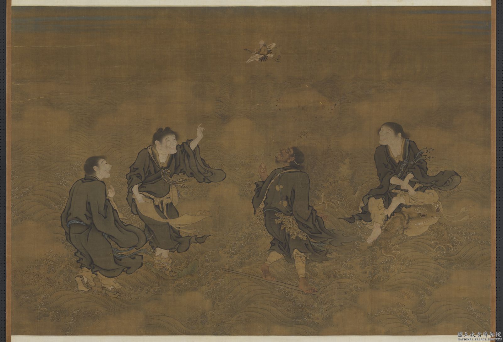 商喜(約活動於15世紀中期),字惟吉,一作恆吉,濮陽(今河南濮陽)人,一作會稽(今浙江紹興)人。宣宗宣德(1426~1435)間供奉內廷,授錦衣衛指揮。精於繪事,尤善長歷史畫。 本圖所繪皆為佛道人物,圖中四位仙人凌波渡海,拱望壽星南極仙翁駕鶴淩空。其中趺坐在三腳蟾蜍上,似為全真教五祖之一的劉海蟾;腳踏拐杖、身繫葫蘆者為李鐵拐;另外二人,一足踏竹帚;一足踏蕉葉,似為狂顛禪僧寒山、拾得。畫中人物表情生動,如在對語。袖擺衣角隨風翻飛,衣描線條頓折有力,而波波滾動的浪濤運用戰筆描繪,更顯得勁利壯闊,是一幅作風細謹的吉祥畫。