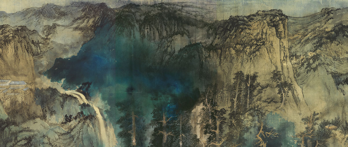 張大千(1899-1983),當代大書畫家。藝術造詣從傳統明清兩朝奠基,進而上溯唐宋,取資敦煌石窟,其後居停歐美,再回台灣定居,這種經歷兼具時潮眼界,在傳統筆墨的基礎上,另闢潑墨、潑彩新格局,對近現代水墨畫發展深具影響。 〈廬山圖〉於民國七十年(1981)七月在摩耶精舍開筆,前後歷時一年又七個月(1981-1983)。此作是張大千畢生最大的單幅作品,也是晚年用力最深的鉅作,雖非出自對景寫生,但凝聚了大千畢生的畫藝精粹,筆墨縱橫排盪,並融合潑彩大寫意法,畫面布局雄偉,吞吐著極其撼人的氣勢。代表張大千暮年勇於挑戰自我極限,以及在青綠潑彩一格的高度成就。
