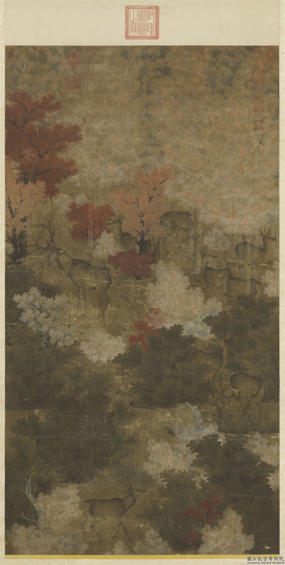 本幅繪群鹿嬉遊、憩息於楓紅層層與白樺交錯的樹叢中,畫面洋溢著北國的秋日景象。畫鹿全以淡墨分染,主樹部分先以墨畫枝幹,再鈎勒層疊密聚的樹葉,並依樹種分別塡染深淺朱紅、白粉、赭黃、淡墨、淡螺青等色,斑爛多彩。此作和故宮藏另幅〈丹楓呦鹿〉(2012年指定公告為國寶)的風格、尺寸極為接近,皆無作者款印,學界咸認為與此幅同屬一組畫作。