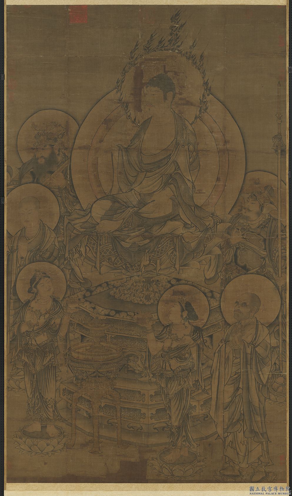 此幅畫佛陀半跏趺坐於蓮座,座側有二天王、阿難、大迦葉和二供養菩薩圍繞。坐佛長眉細目,法相莊嚴;二天王身穿盔甲,手持劍槊,神情威武。全作人物神情各異,栩栩如生。畫中供養菩薩體態豐腴,衣紋沿線以墨暈染,仍見晚唐餘風;而坐佛肉髻低平,髻底有一隆起物,具宋代佛像的特色,推測畫成時代或在北宋早期。畫幅四角分鈐「雙龍」、「政龢」、「政和」、「宣龢」四個半印,符合「宣和裝」鈐印形式,或曾為徽宗內府所收。