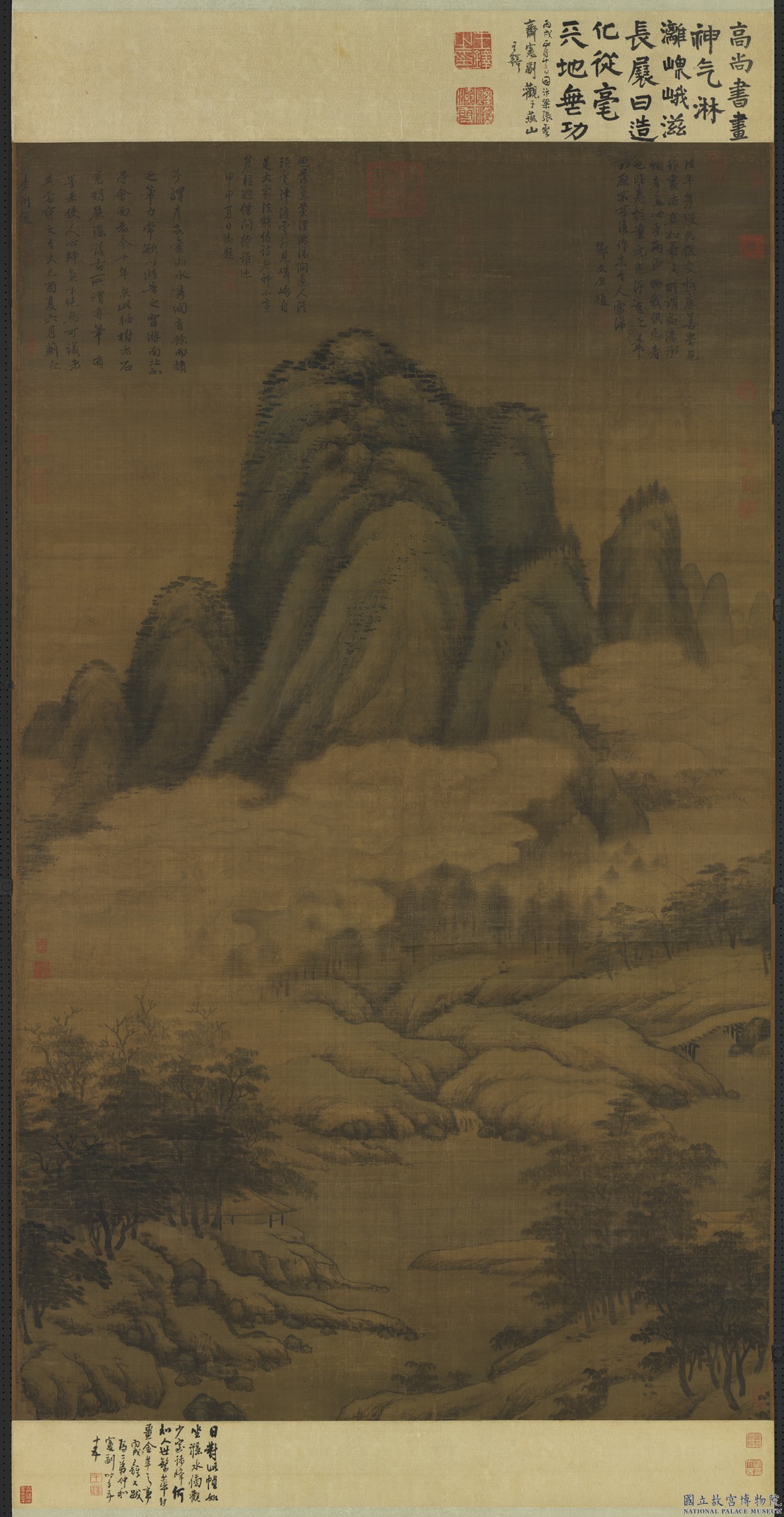 高克恭(1284—1310)是元初的文人畫家,原屬回族,可謂非漢族士人參與元朝中國書畫創作的先鋒,時人常將之與南方的趙孟頫相提並論,有「南趙北高」之稱。 〈雲橫秀嶺〉既見強大塊量感的主山,展現北方巨障山水的氣勢;亦有蜿蜒的河流、雲嵐,與圓緩的峰巒水渚,流露出南方米家山水風格的溫潤,兼具南北兩地山水畫的風格特色。而古樸典雅的青綠設色,則增添盎然生意的筆墨趣味,表現畫家獨特的藝術造詣。 此畫雖無署款,幅上方有鄧文原(1258-1328)與李衎題識,指為高克恭(敬彥)所畫。二者均為高氏好友,題識所言當真實不虛。全幅反映出元初的復古運動,畫風綜合了畫史上各種重要的傳統,堪稱高克恭的山水典型風範。
