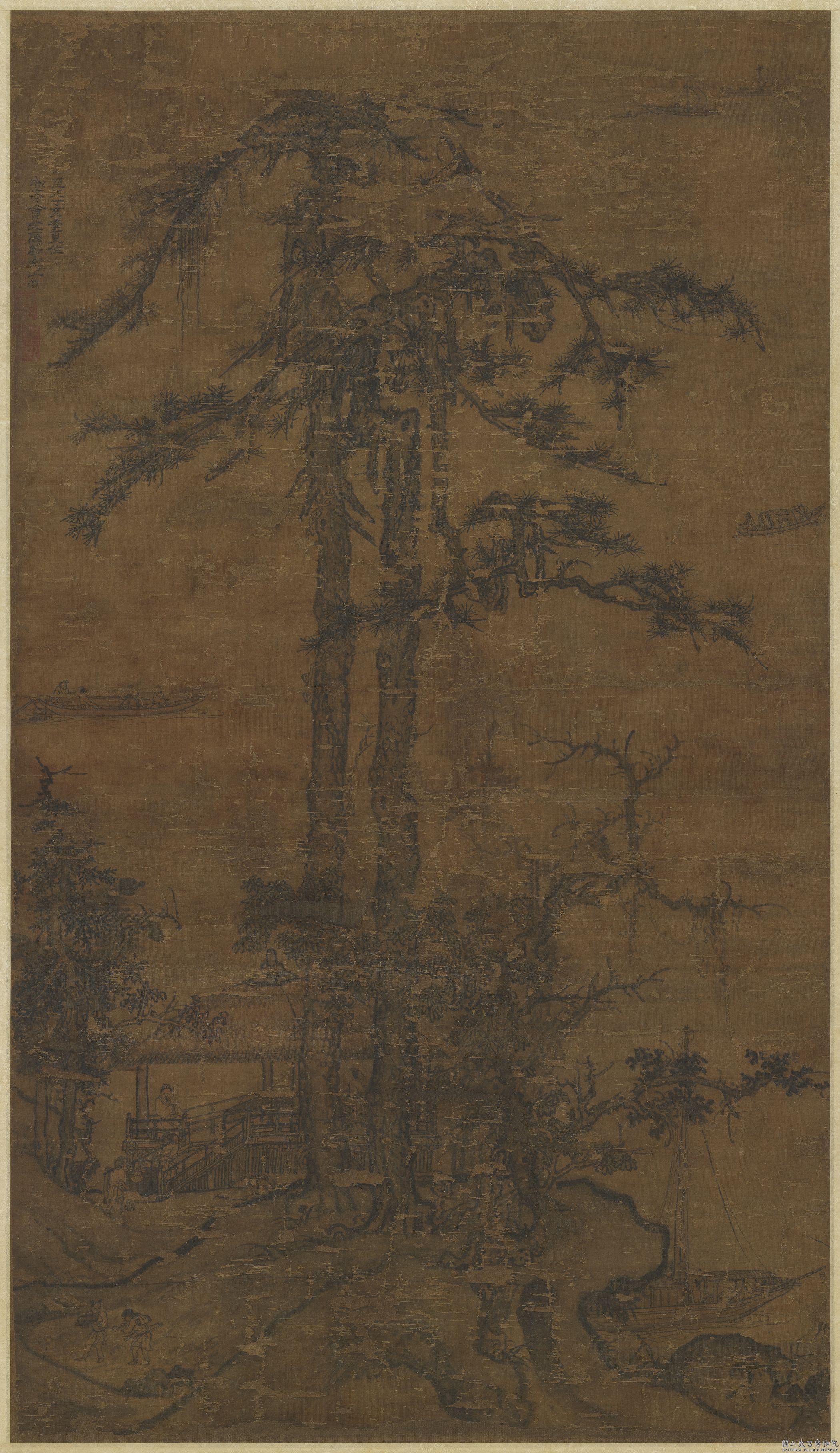 王淵(活動於1299-1366年間),浙江錢塘(今杭州)人。字若水,號澹軒。幼習丹青,曾得趙孟頫(1254-1322)(1254-1322)指授。其花鳥師黃筌(903-965),山水師郭熙(活動於11世紀),人物師唐人,皆極精妙。 〈松亭會友圖〉以平遠法構圖,畫雙松蒼秀挺拔,擎立畫面中央幾近貫穿全幅,其造型古樸穩健,具有李成(919-約967)、郭熙筆意。近景畫臨水茅亭,內有文士二位,一人倚欄坐看僕從 搬運食盒,一人遠眺江面之水闊天空。人物用筆熟練,生動合度。雙松位置凸顯於主要畫面,表達了作者藉老松而喻畫中雙友的意圖。松樹上端又畫遠帆艤舟,隨風遠颺,全幅景致清遠幽靜。幅間隸體款書:「至正丁亥季夏作松亭會友圖。若水王淵」,是知繪於元順帝至正七年(1347)。