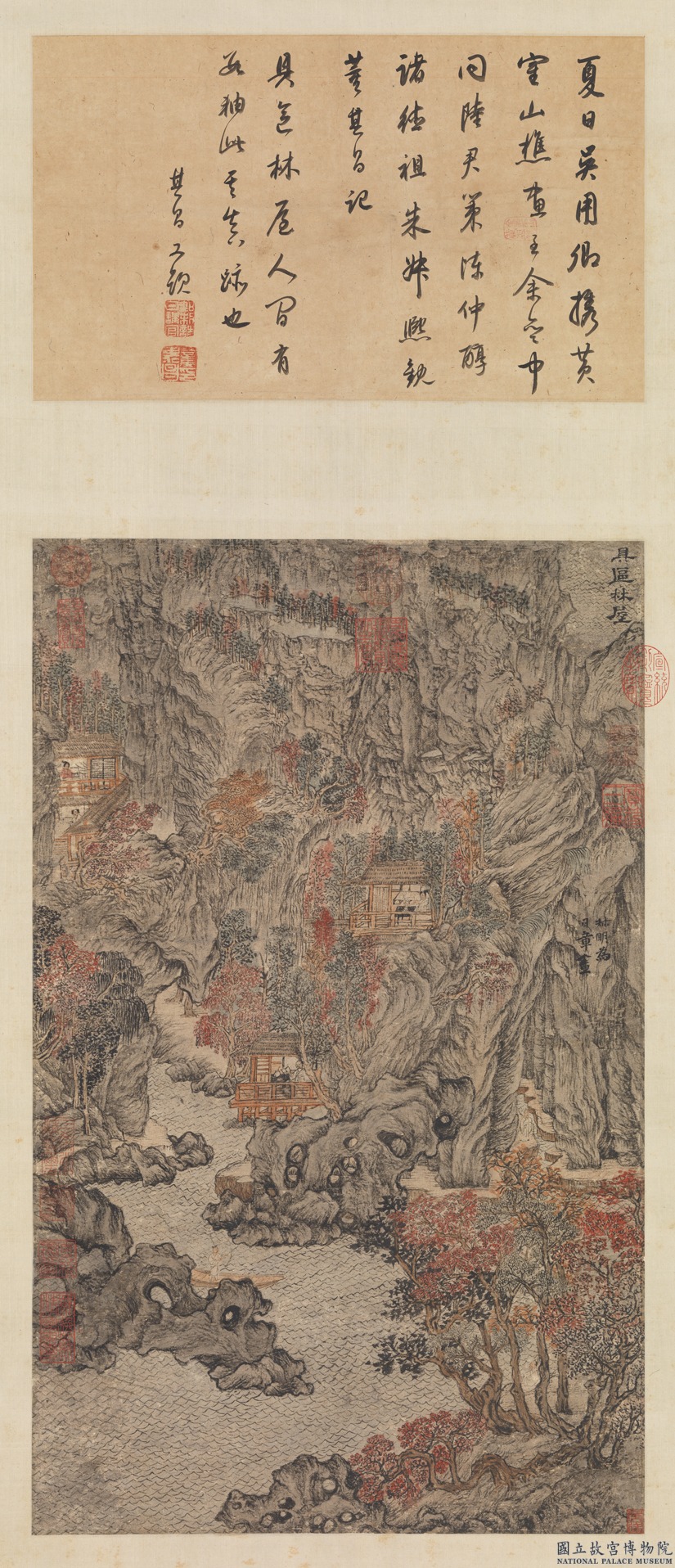 王蒙(1308-1385),元末畫家,是趙孟頫(1254-1322)的外孫。與黃公望(1269-1354)、吳鎮(1280-1354)和倪瓚(1301-1374),合稱為「元四大家」。 〈具區林屋〉全作山石樹木層疊充塞,構圖幾乎密不透風,在中國畫史上堪稱罕見。全幅洞壑玲瓏,溪畔村舍水榭錯落,山石以乾筆牛毛皴皴擦,筆法熟練多變。樹葉以赭石、藤黃、朱砂點染,遂使秋意滿幅,用筆設色,俱至神妙。畫家在虛實相濟的觀念下,似乎有意於畫幅的右上角營造出「透」的部分,使得全作迫塞的感覺,一掃而空。 此幅藝術造詣獨具特色,中國山水畫結構自北宋的繁實、南宋的取虛,發展至此又邁向另一嶄新境界,能代表元代山水畫演變發展下之流派典型。